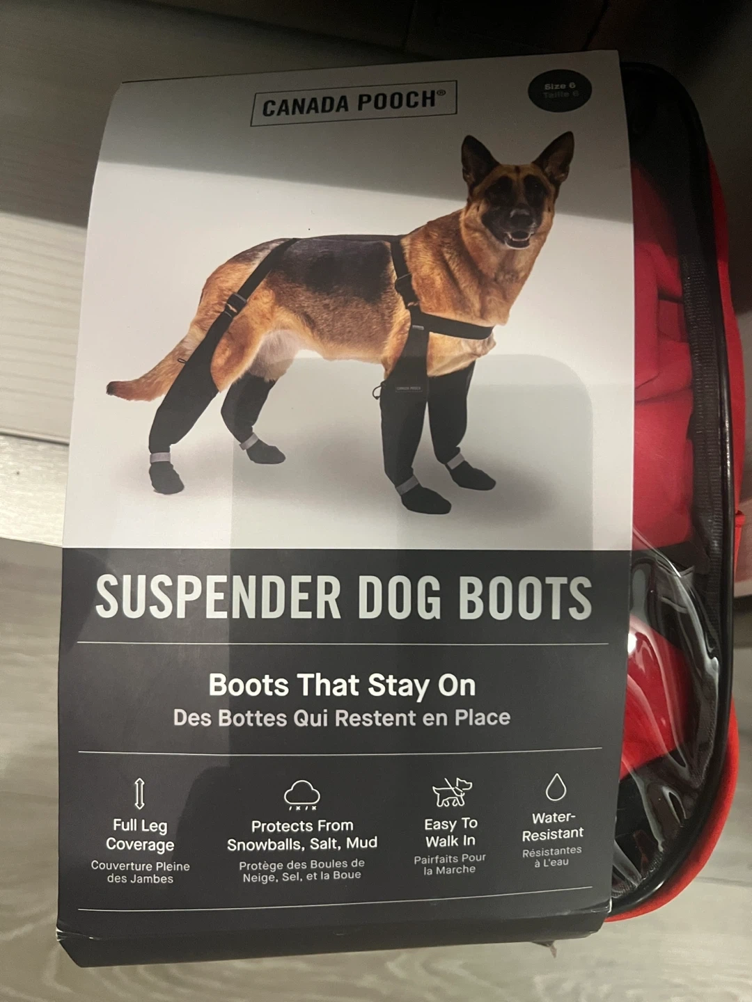 I’m selling my Canada Pooch suspender dog boots in red, size 6.