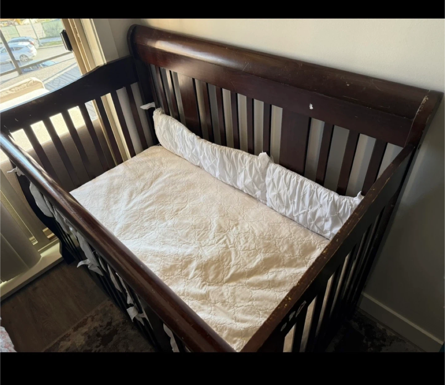A dark wood sleigh style crib is shown. It includes a quilted mattress pad and a white bumper pad. This crib offers a sturdy and classic design for a nursery.