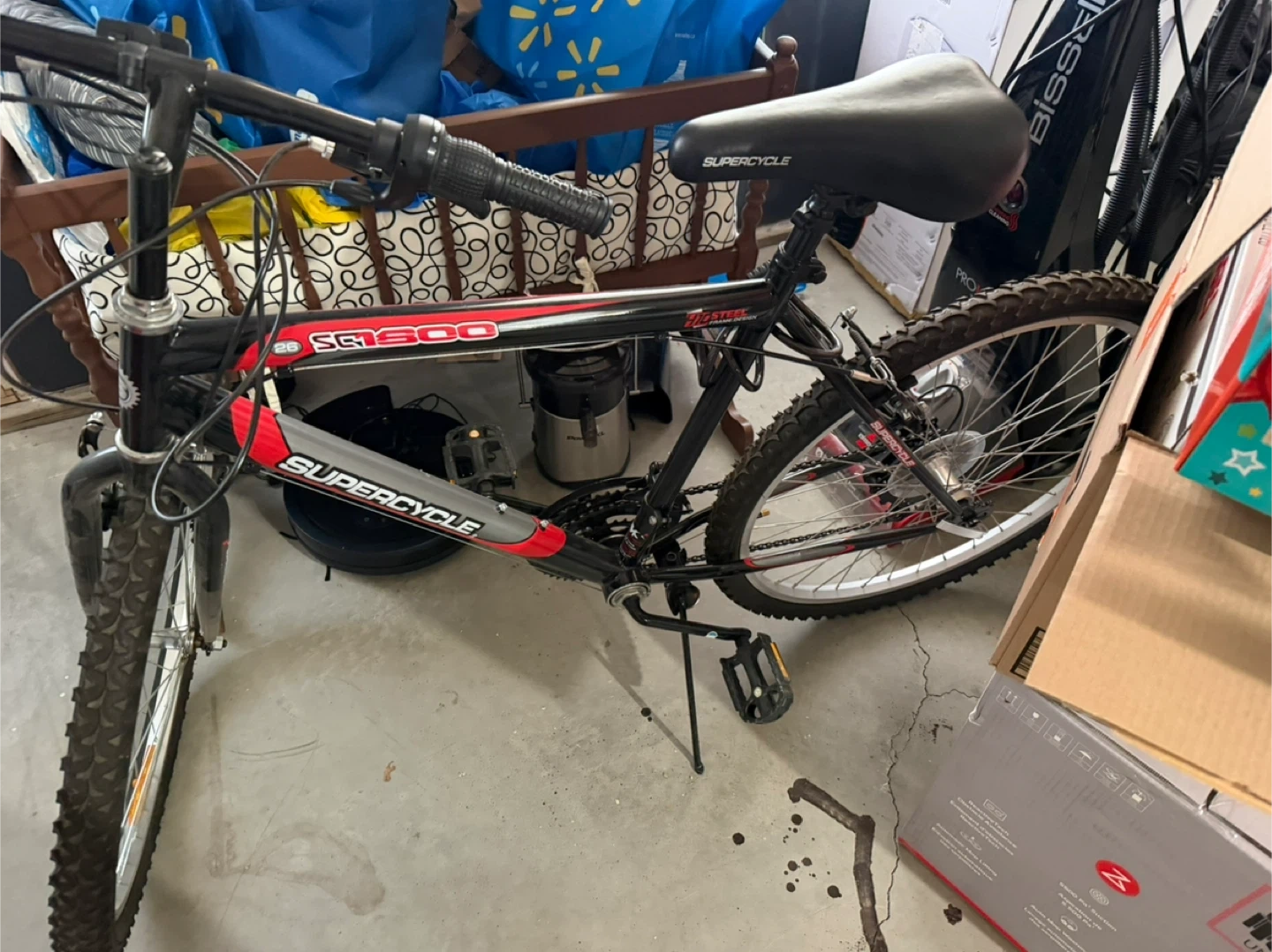 This is a Supercycle SG1500 mountain bike. It features a black frame with red and grey accents. The tires appear to be 26-inch. This bike is suitable for recreational trail riding.