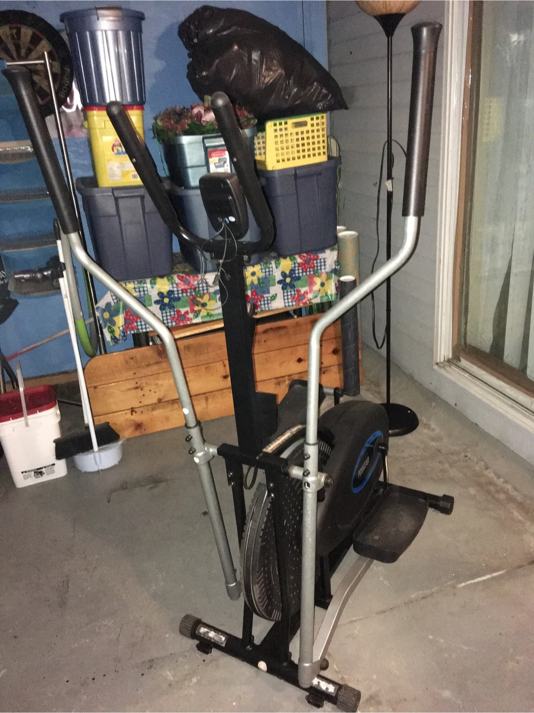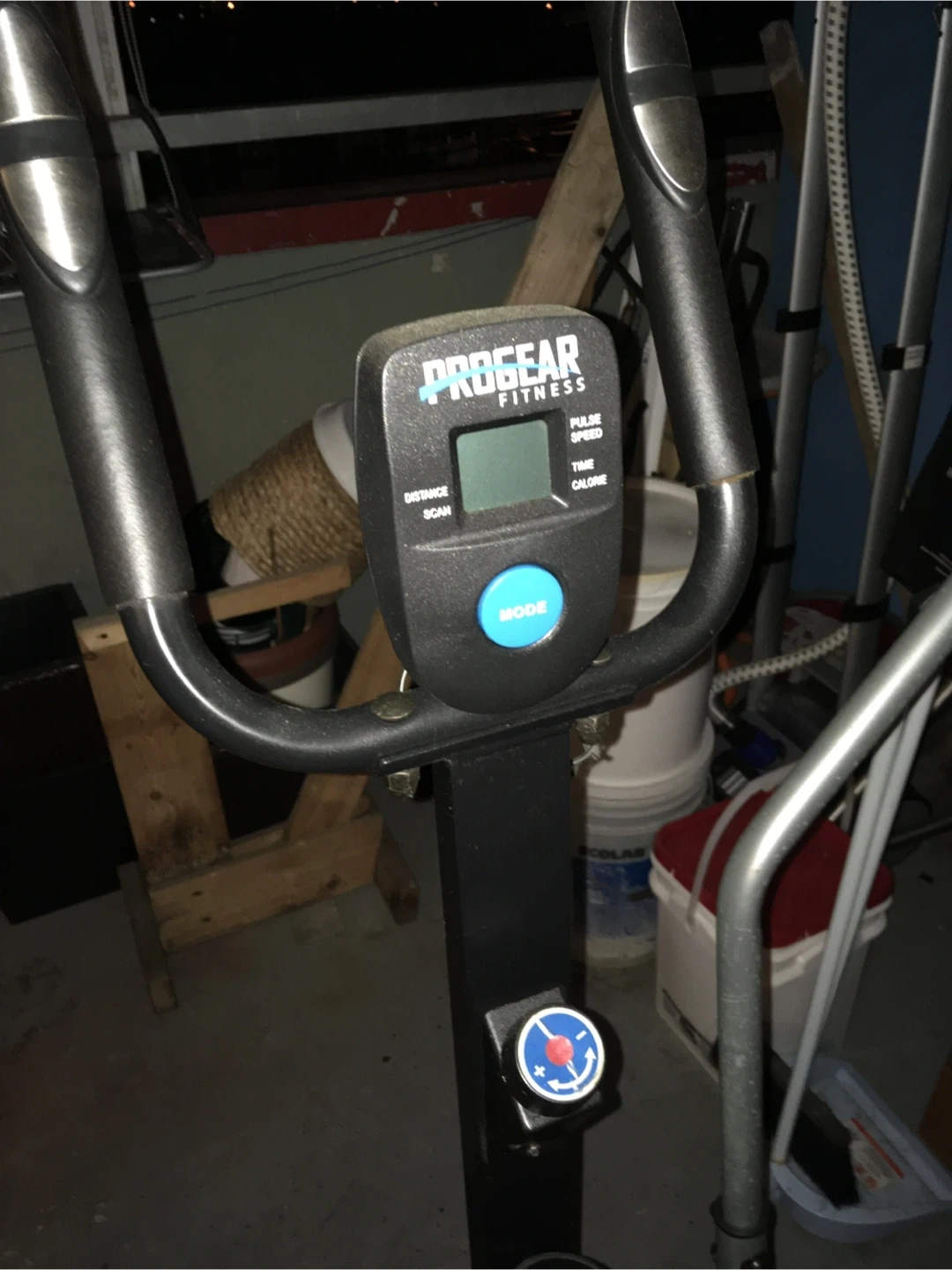 ProGear Air Elliptical Pro for sale. It has a digital display showing distance, scan, pulse, speed, time, and calorie count. The mode button is blue. This elliptical is great for a home workout.