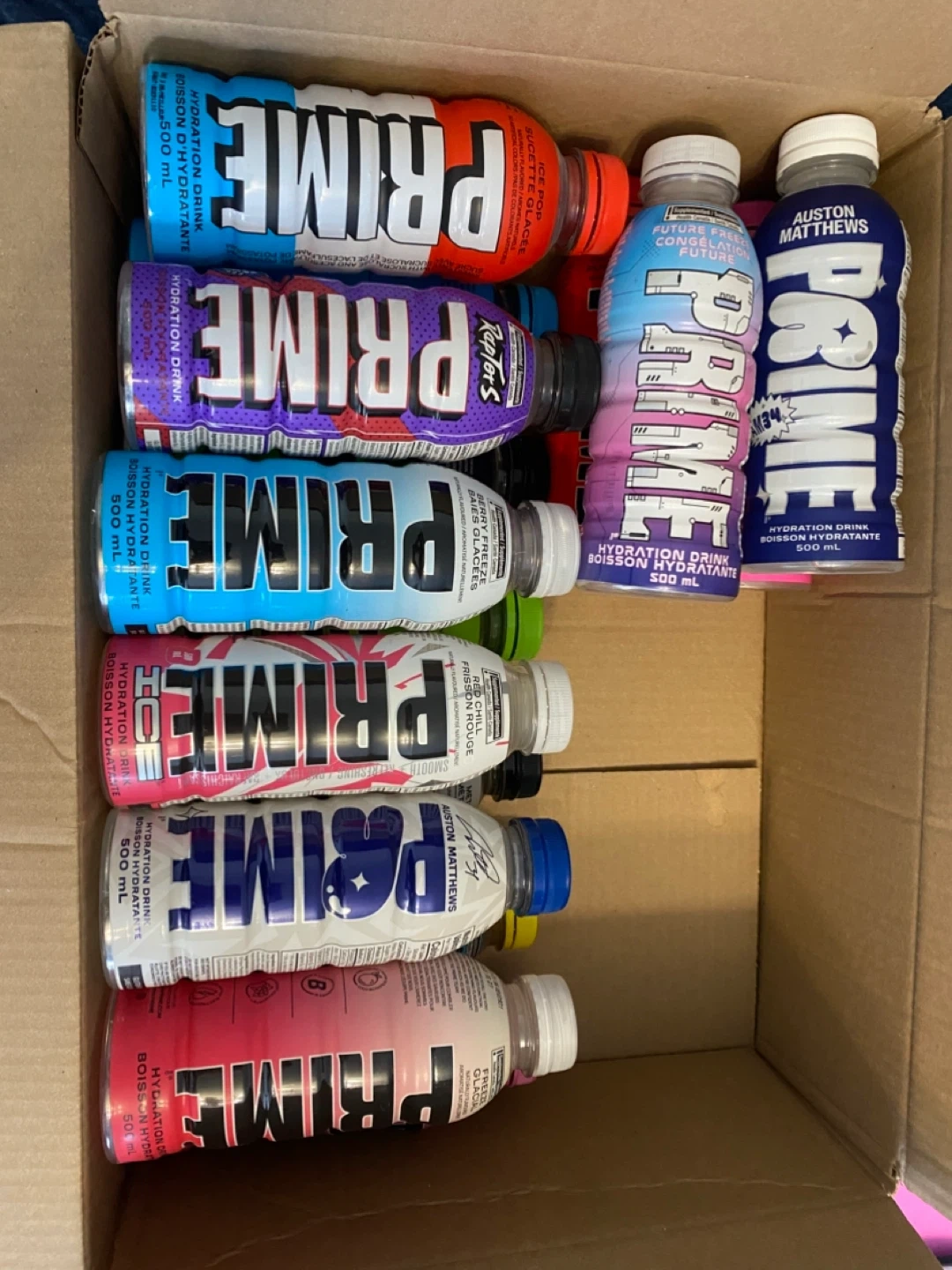 A collection of PRIME Hydration drinks in various flavours, each in a 500ml bottle. Flavours include Ice Pop, Blue Raspberry, Grape, Tropical Punch, Strawberry Watermelon, and Lemonade and much more. They are all empty