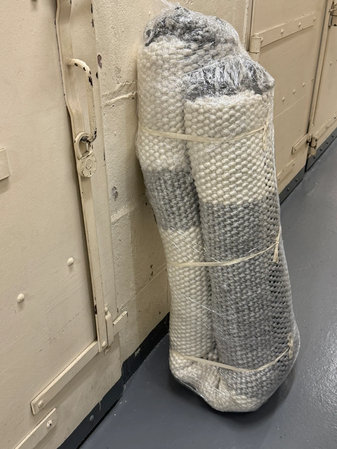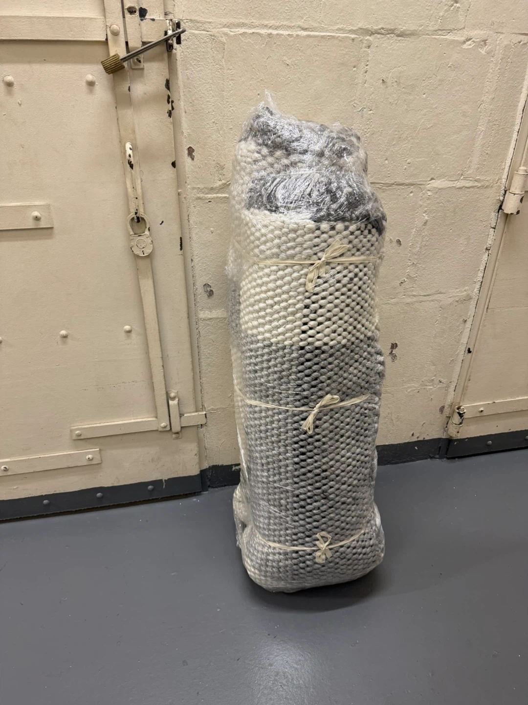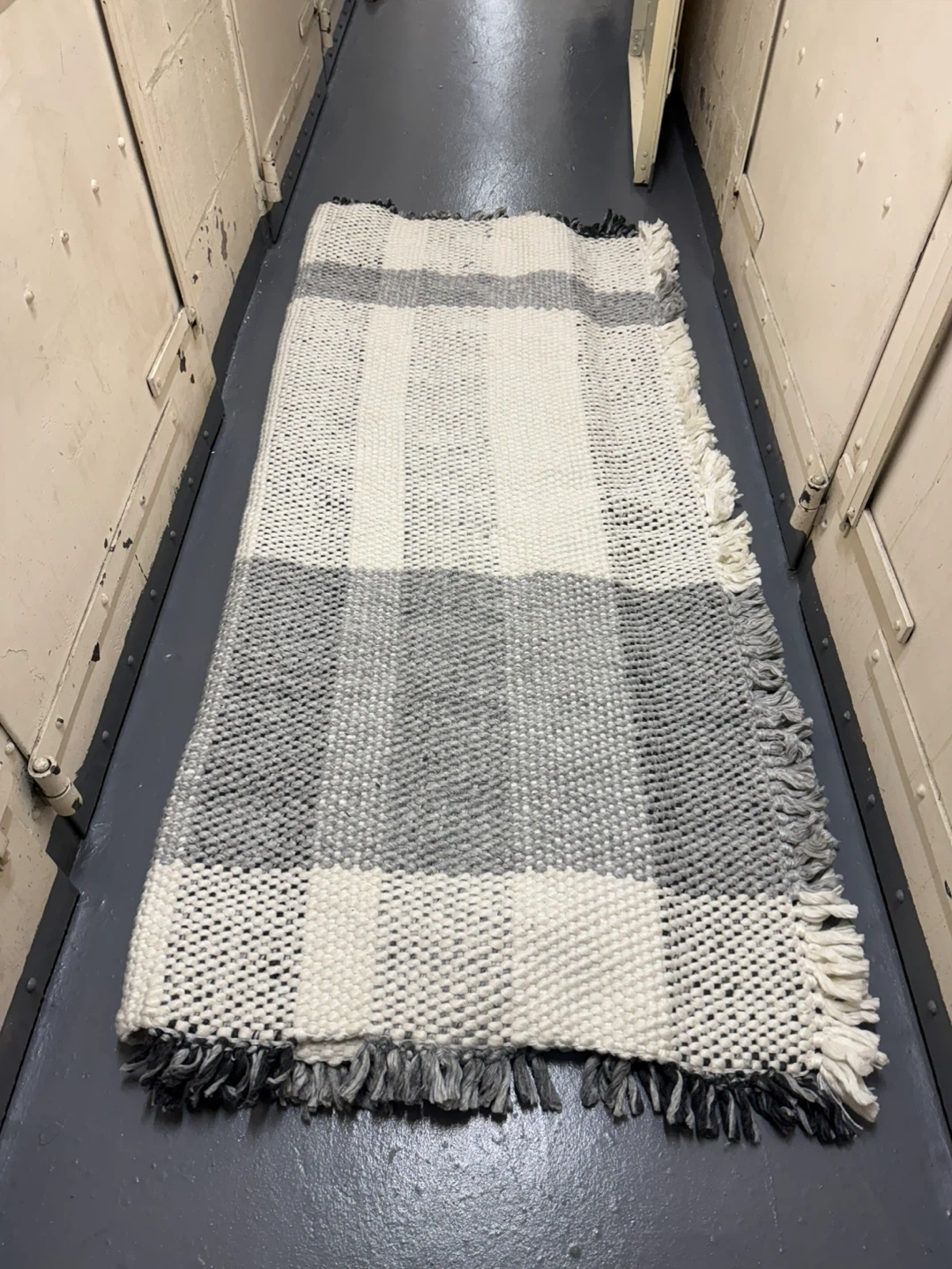 7 feet by 10 feet. Handmade plaid rug with black and white pattern. Has fringes on the edges. Half of the rug is clean & the other half is dirty. Please see pictures. This rug would add a cozy touch to any room!
