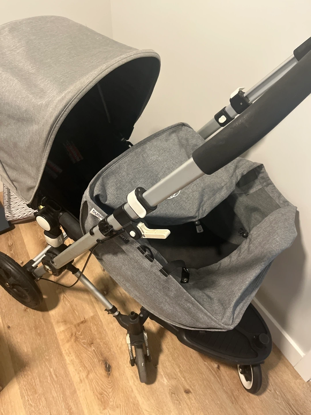 Grey Bugaboo Cameleon stroller with black seat. It's a versatile stroller, perfect for navigating different terrains. It has a reversible seat and adjustable handlebar.