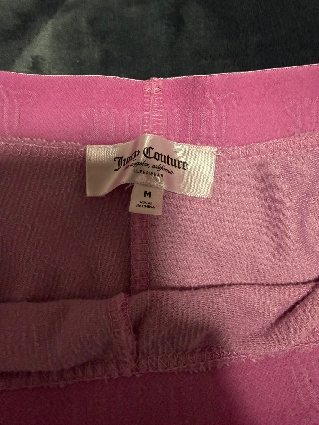 These Juicy Couture sleepwear shorts are a comfy pink velour. They have the Juicy Couture logo on the back with rhinestone embellishments. Size medium and made in China.
