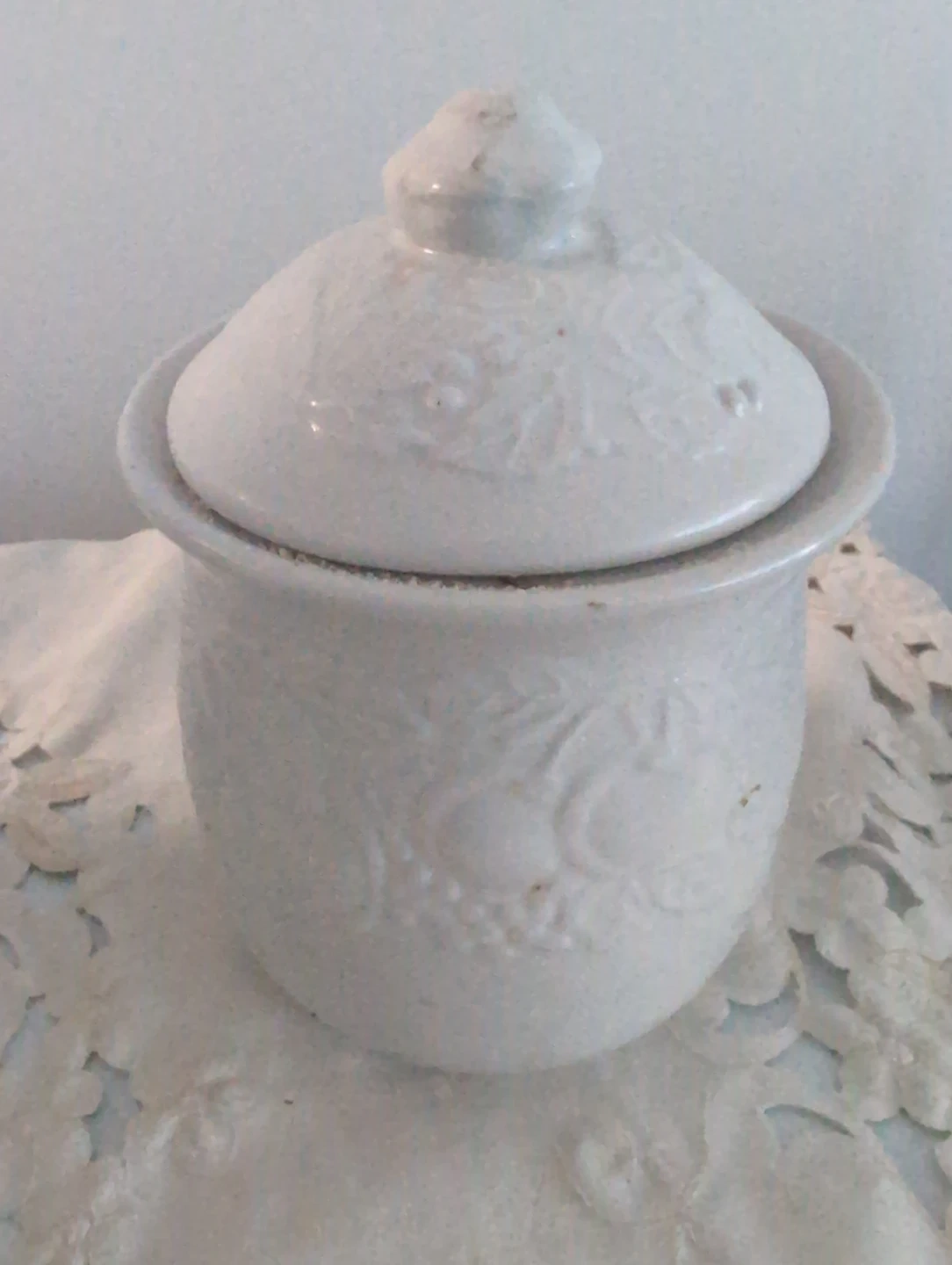 This is a vintage ceramic canister with a lid. It features an embossed floral and fruit design. Its white ceramic material makes it a classic addition to any kitchen storage. I am using it to store rice
