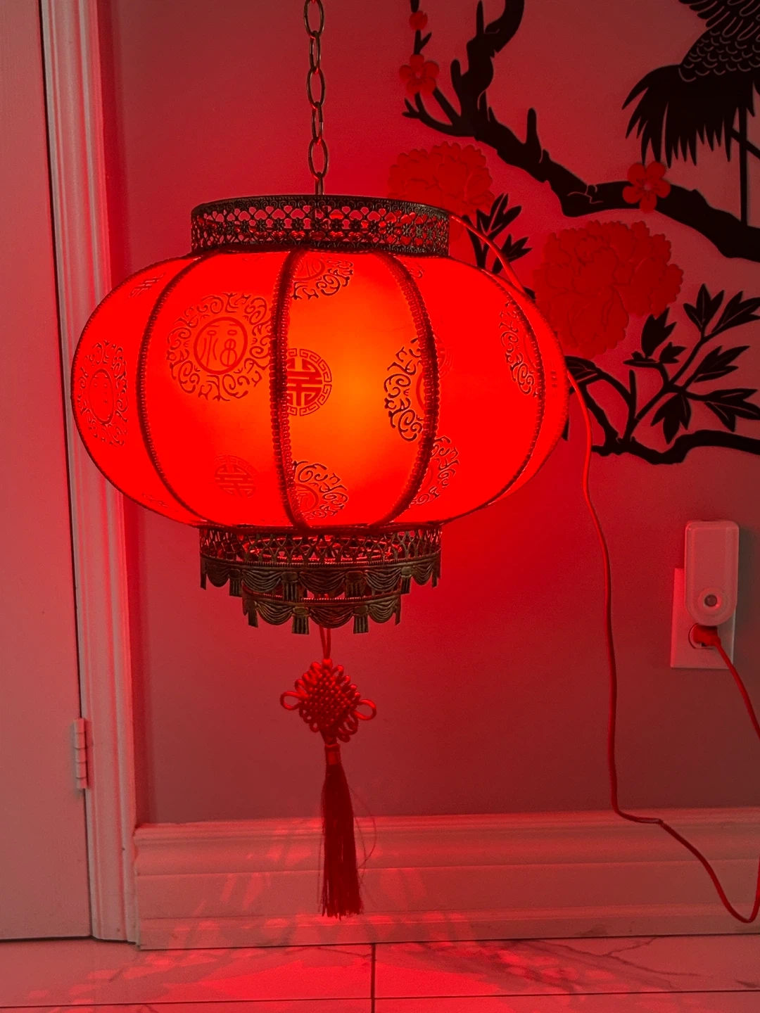 This bright red decorative lantern has intricate gold detailing and a tassel accent. It's perfect for adding a touch of festive ambiance to any space. The metal frame and fabric construction ensure durability. The lantern can be plugged in to provide a bright light, originally bought for $68+ tax. Now selling for $30.