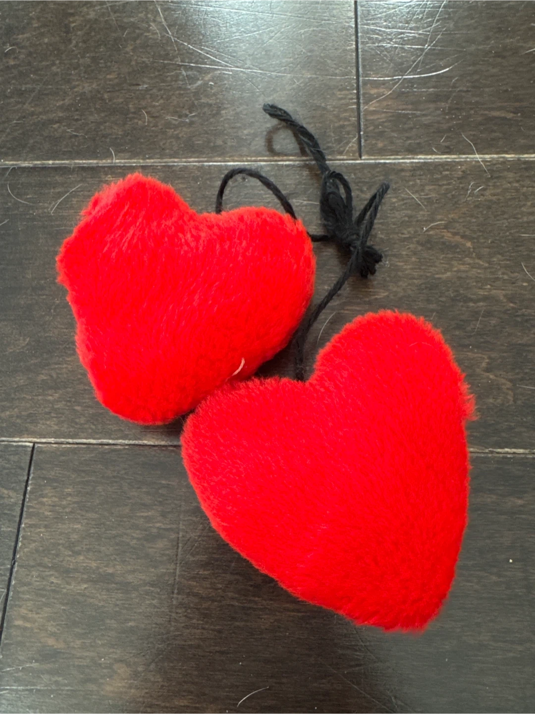 A pair of bright red plush heart ornaments. They're made of soft, fuzzy material. Includes black string for hanging.