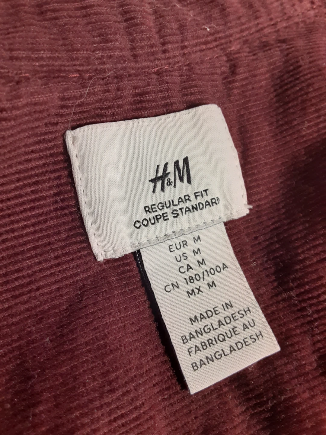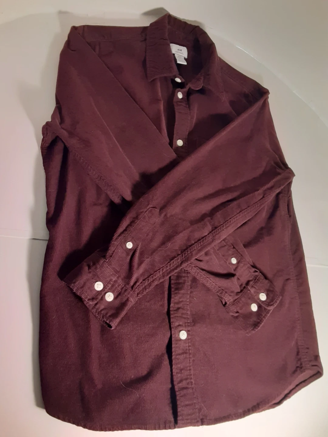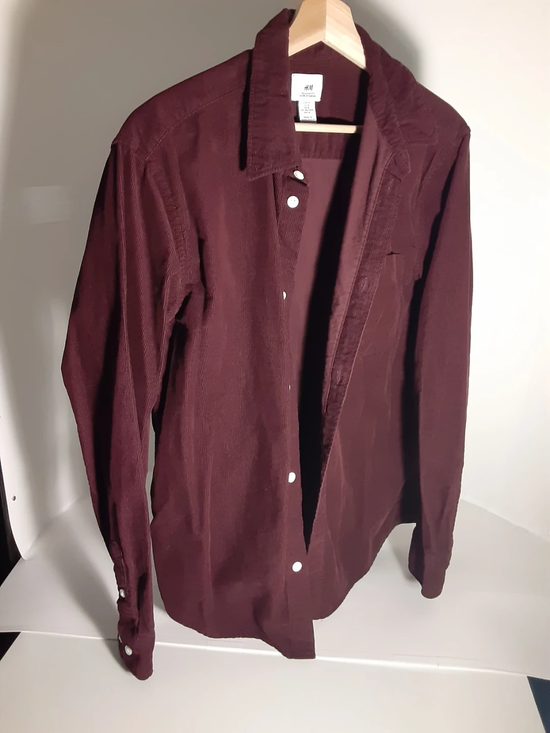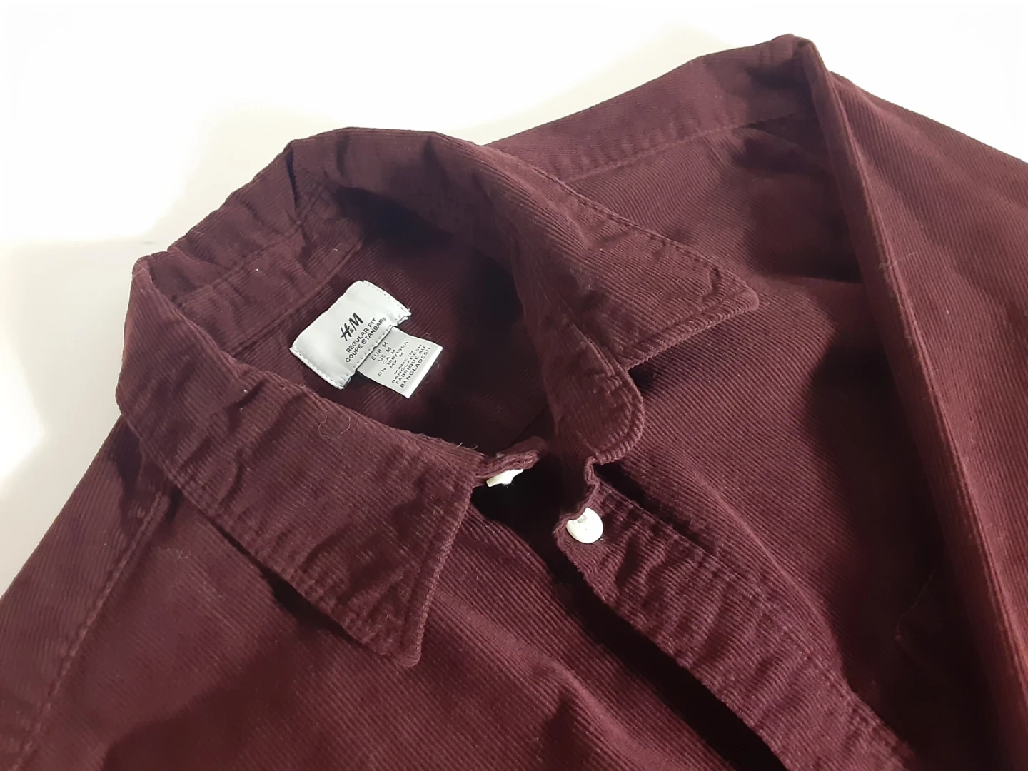 A burgundy long-sleeved corduroy shirt from H&M, sized medium. It's made of 100% cotton with white button closures. This shirt is a comfortable and stylish choice for casual wear and is in excellent condition..
