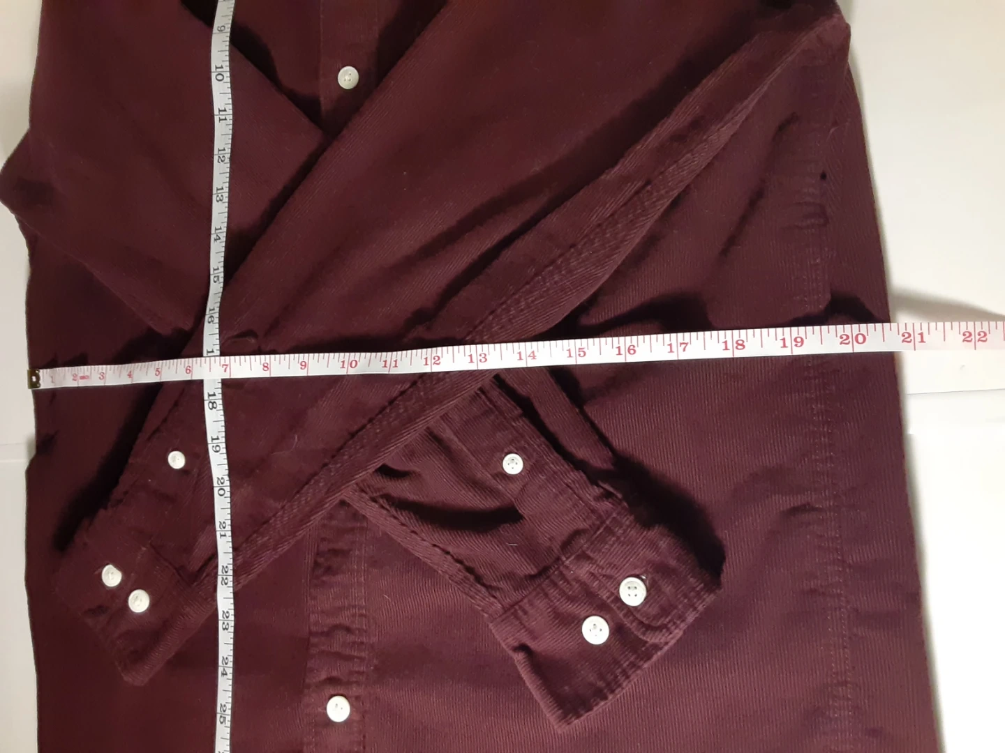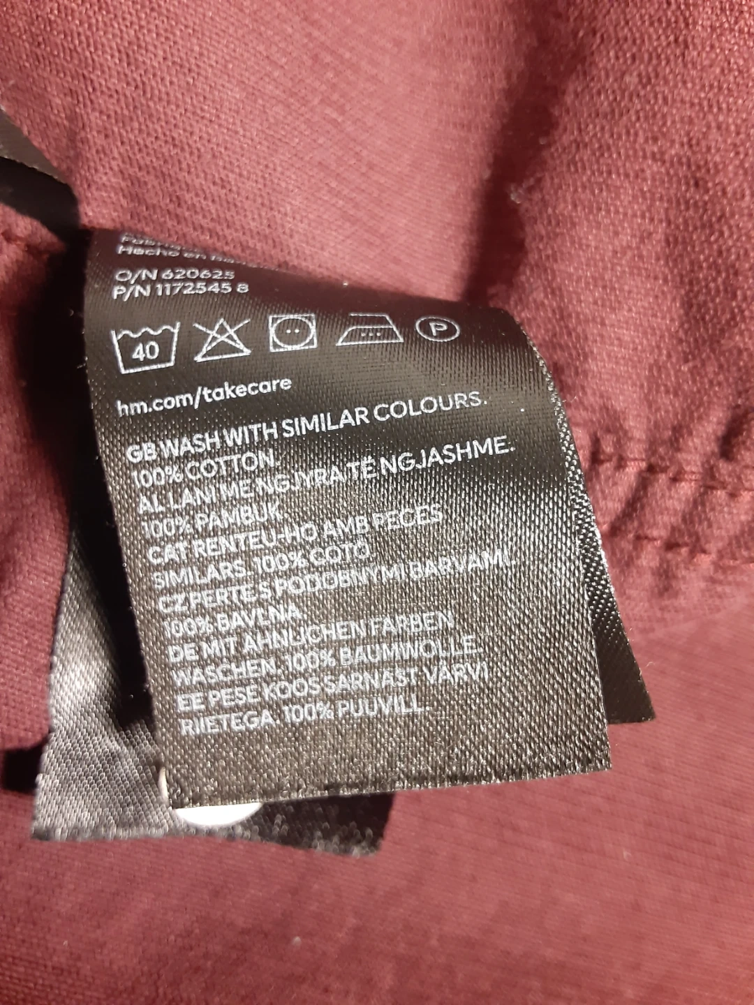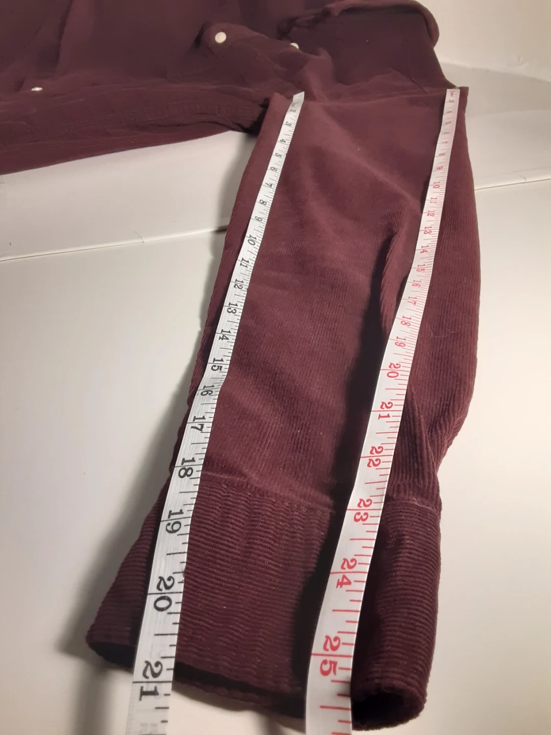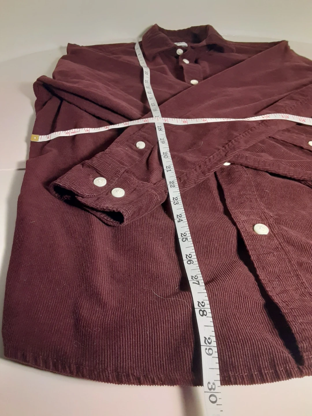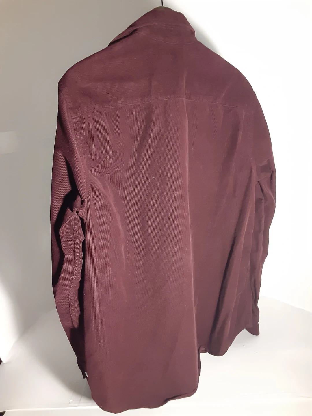 A burgundy long-sleeved corduroy shirt from H&M, sized medium. It's made of 100% cotton with white button closures. This shirt is a comfortable and stylish choice for casual wear and is in excellent condition..