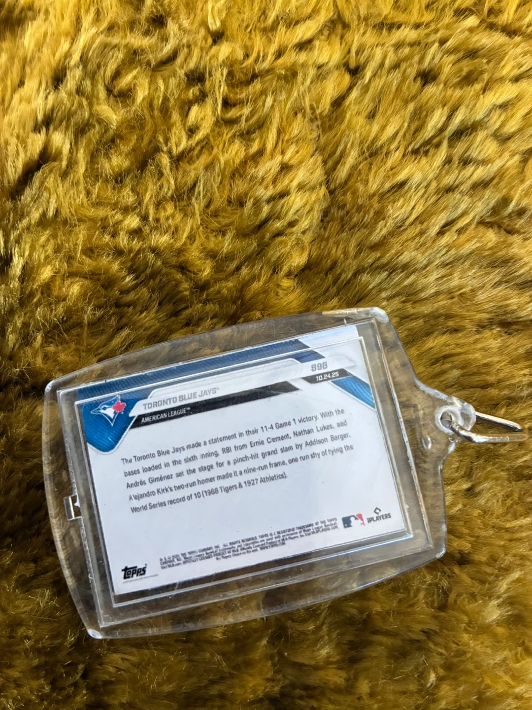 Features a Toronto Blue Jays baseball card in a protective keychain. The card commemorates a 11-4 Game 1 victory. Perfect for any Blue Jays fan!