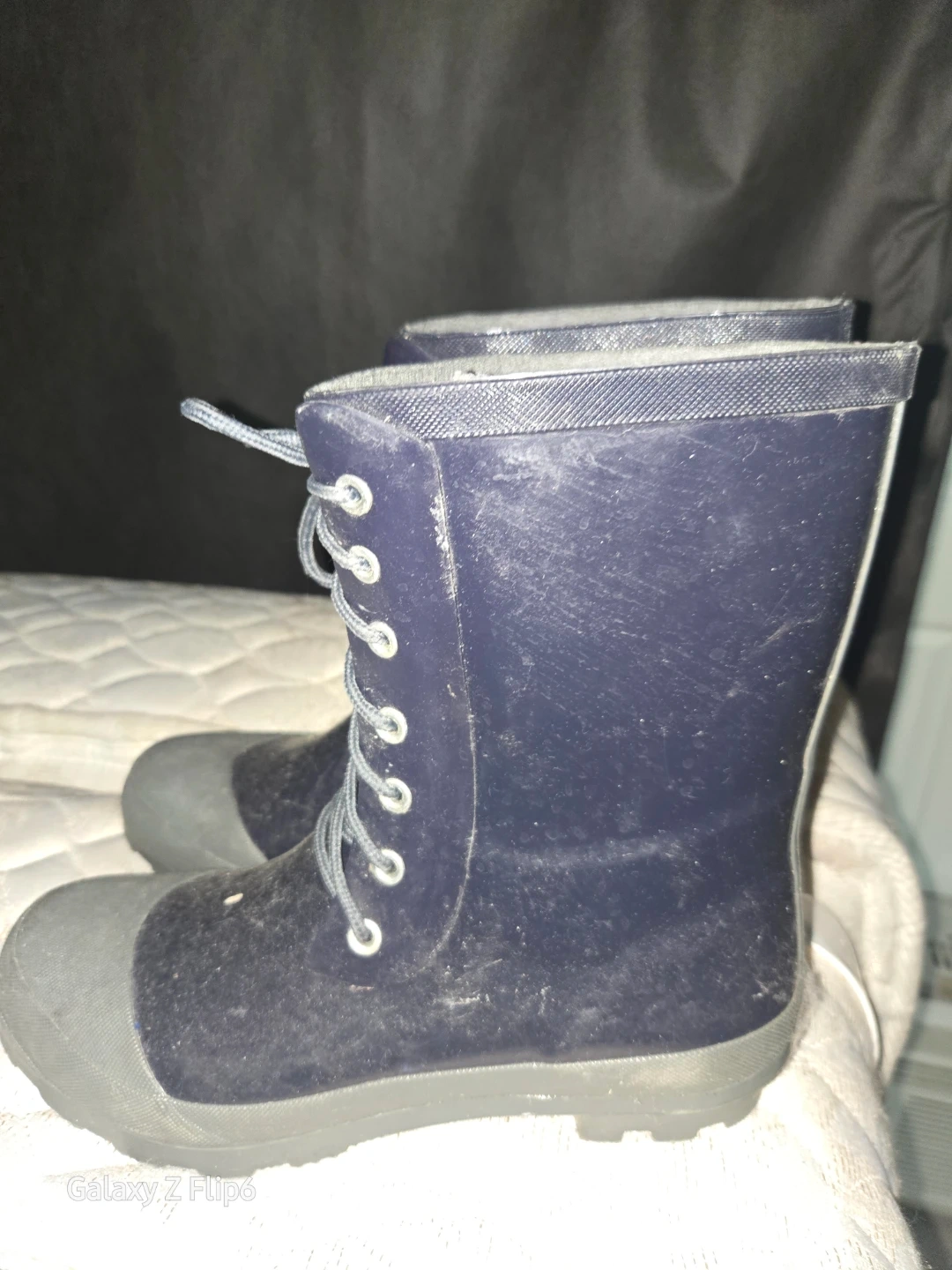 Navy blue rubber rain boots by Electric Karma. Lined for comfort and featuring a lace-up front. Size is 8. Great for puddle jumping!