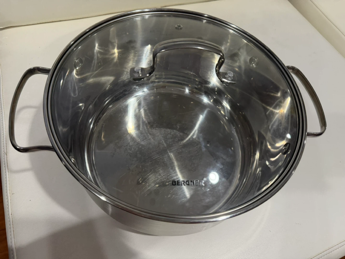 This is a Bergner stainless steel pot. It comes with a clear glass lid with a handle. The pot has sturdy side handles for easy carrying. It's suitable for various cooking tasks in the kitchen.