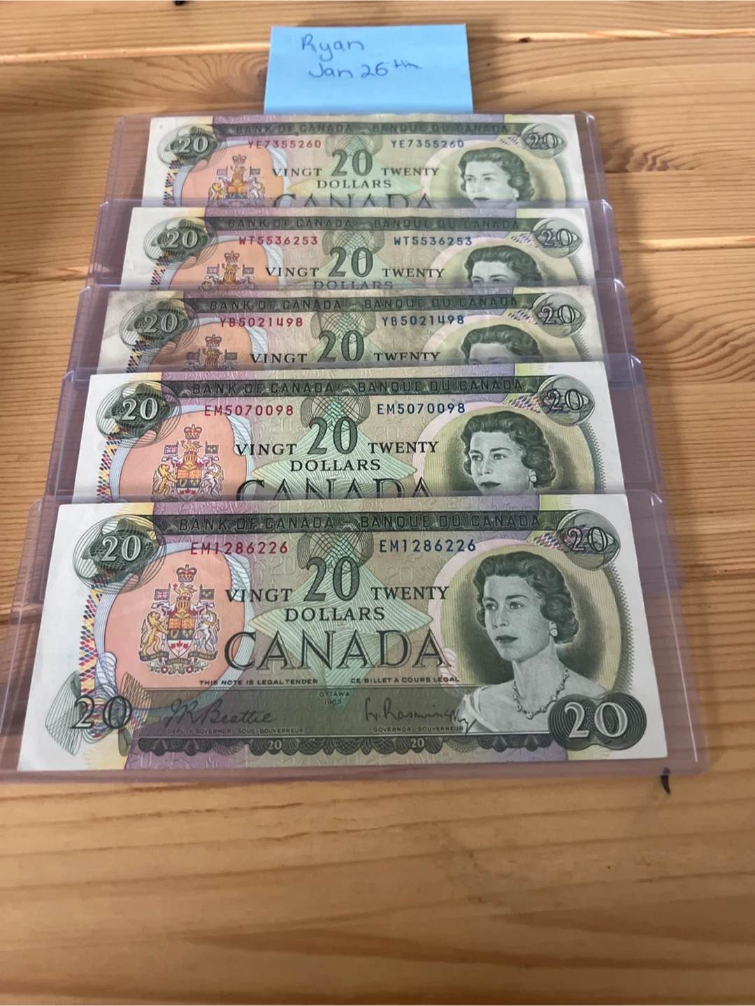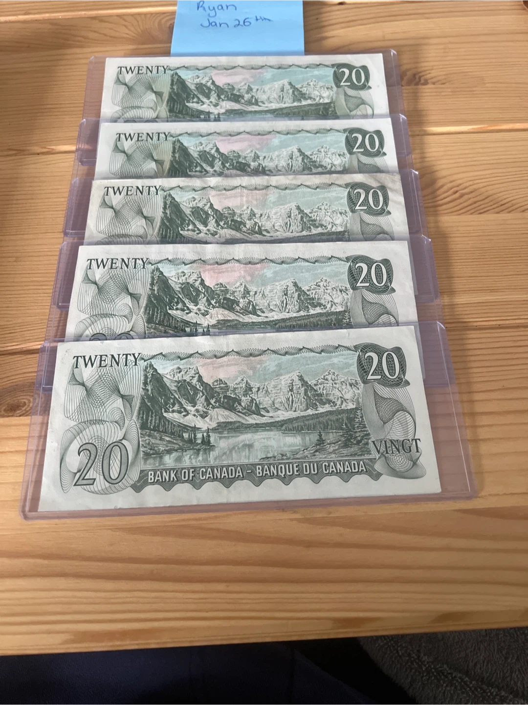 1969 Canadian twenty-dollar bills. Each note features Queen Elizabeth II on one side and the Canadian Rockies on the other. 60$ each or 260$ for 5. they all come with a protective sleeve.