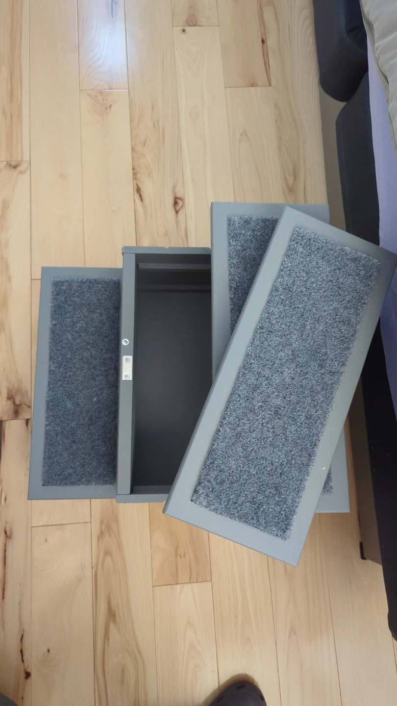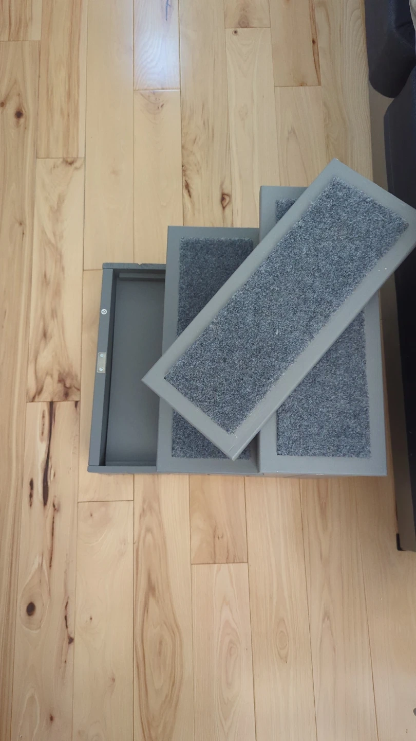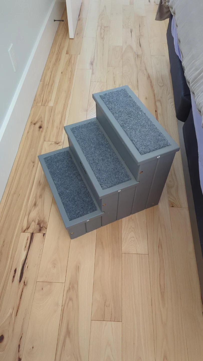PawHut 3-step pet stairs in grey, with toy storage! These steps are carpeted for traction. They help pets reach elevated surfaces like beds or couches. Great for older pets or those with mobility issues!