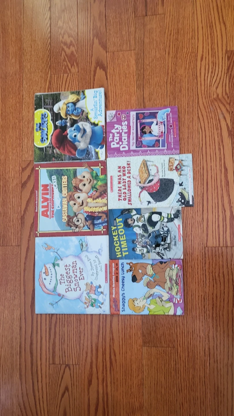 Seven children's books including The Smurfs, Alvin and the Chipmunks: Castaway Critters, The Biggest Snowman Ever, and Shaggy's Cheesy Lunch. Also features Hockey Timeout, The Party Diaries, and There Was an Old Lady Who Swallowed a Desk.