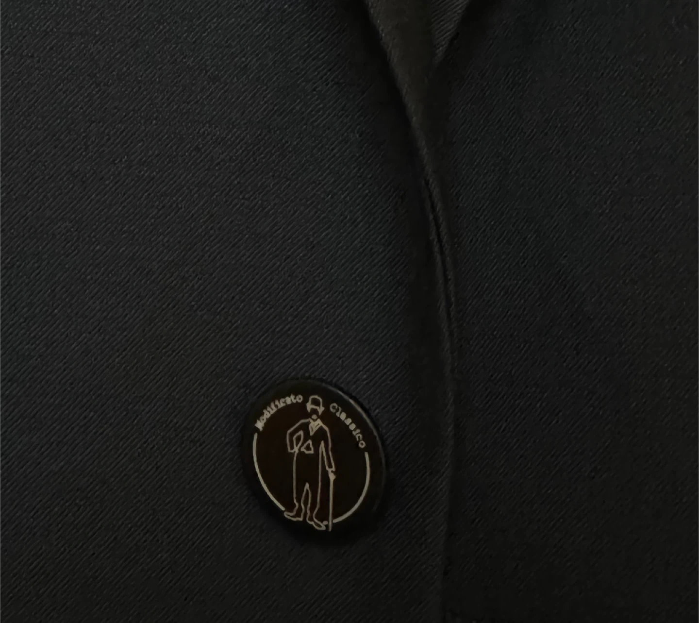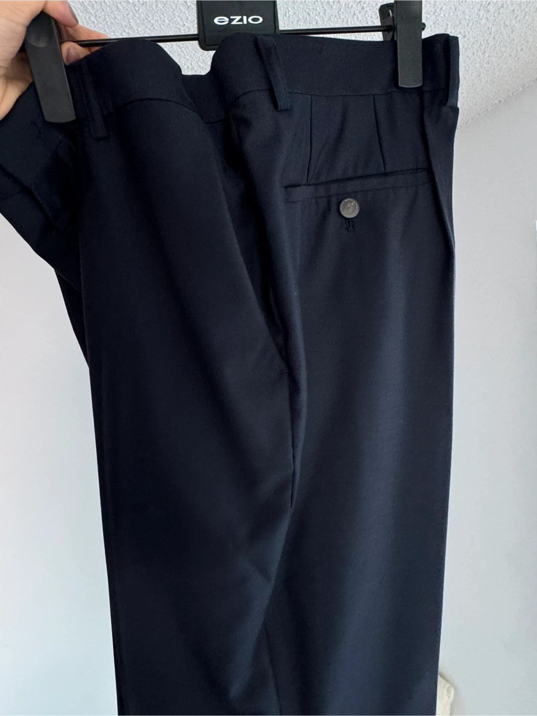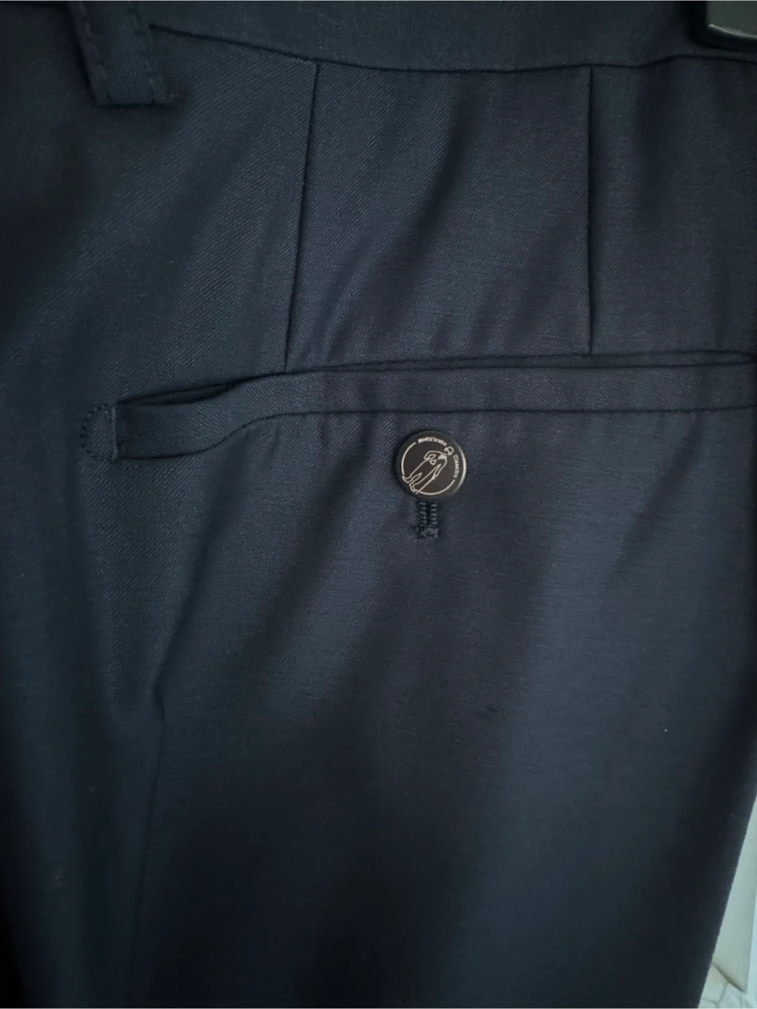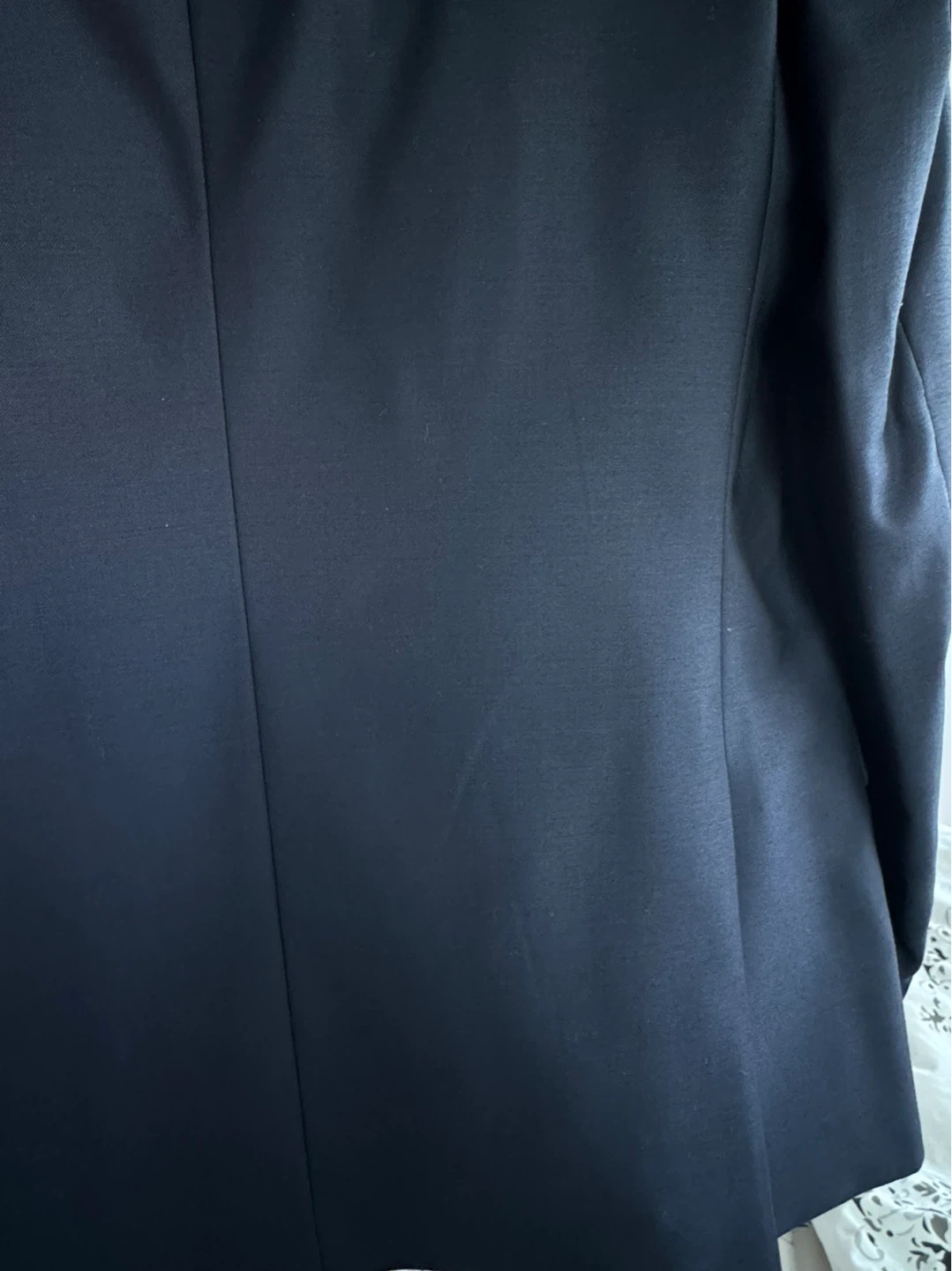 This is a navy blue Ezio suit jacket and matching pants. The jacket features a classic two-button closure and detailed inner lining.