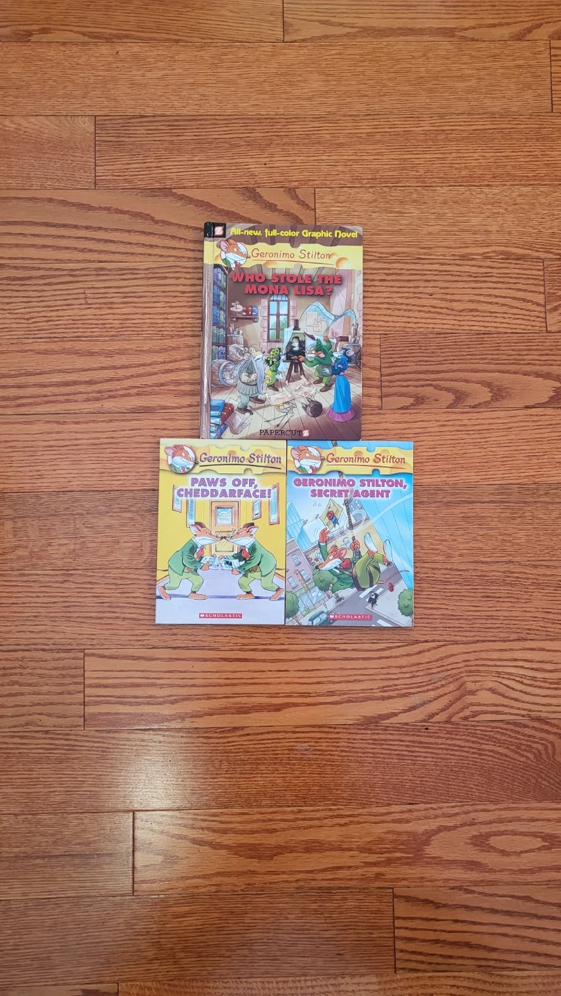 Three Geronimo Stilton books: Who Stole the Mona Lisa, Paws Off Cheddarface!, and Geronimo Stilton, Secret Agent. These are all full-color graphic novels. They're great reads for young adventurers!