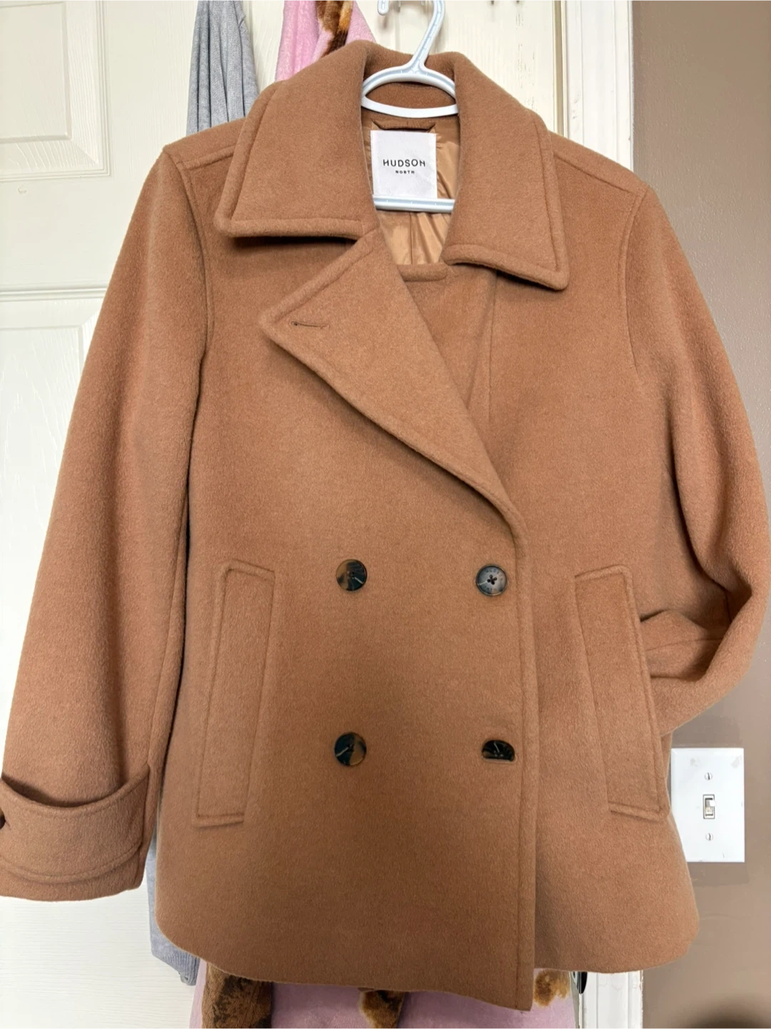 Selling a beautiful short wool-blend coat, worn only once. It is in perfect, like-new condition with no signs of wear.