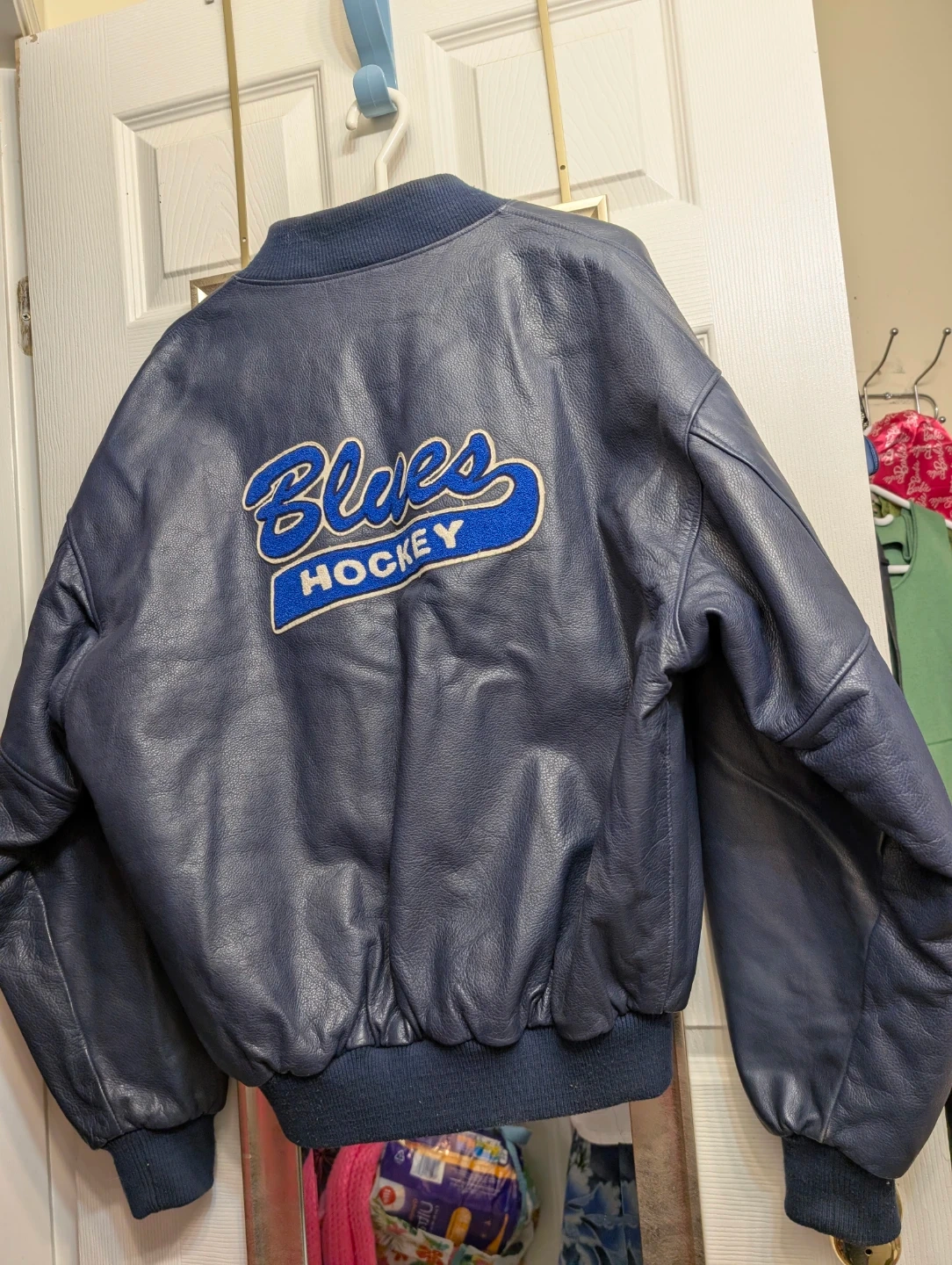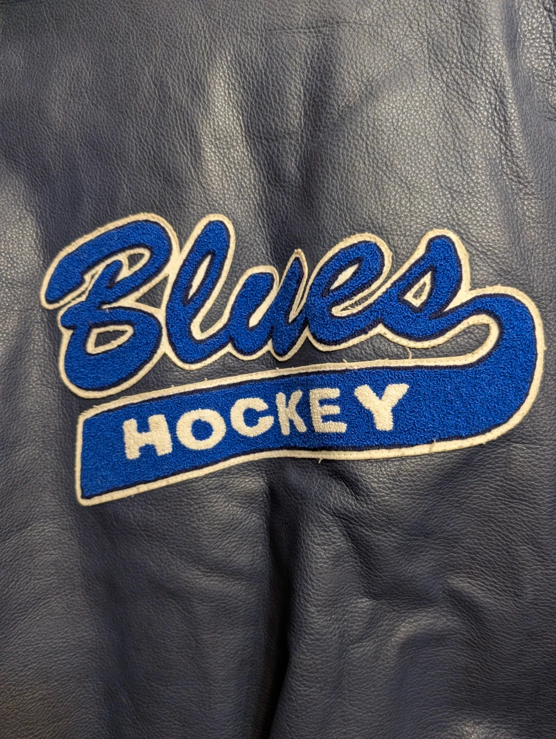 Large-XL Navy blue leather varsity jacket with Roots Sporting Goods logo on the left chest. Back features Varsity Blues Hockey embroidery. A classic bomber style with snap button closure and ribbed cuffs and hem. Made for hockey fans!