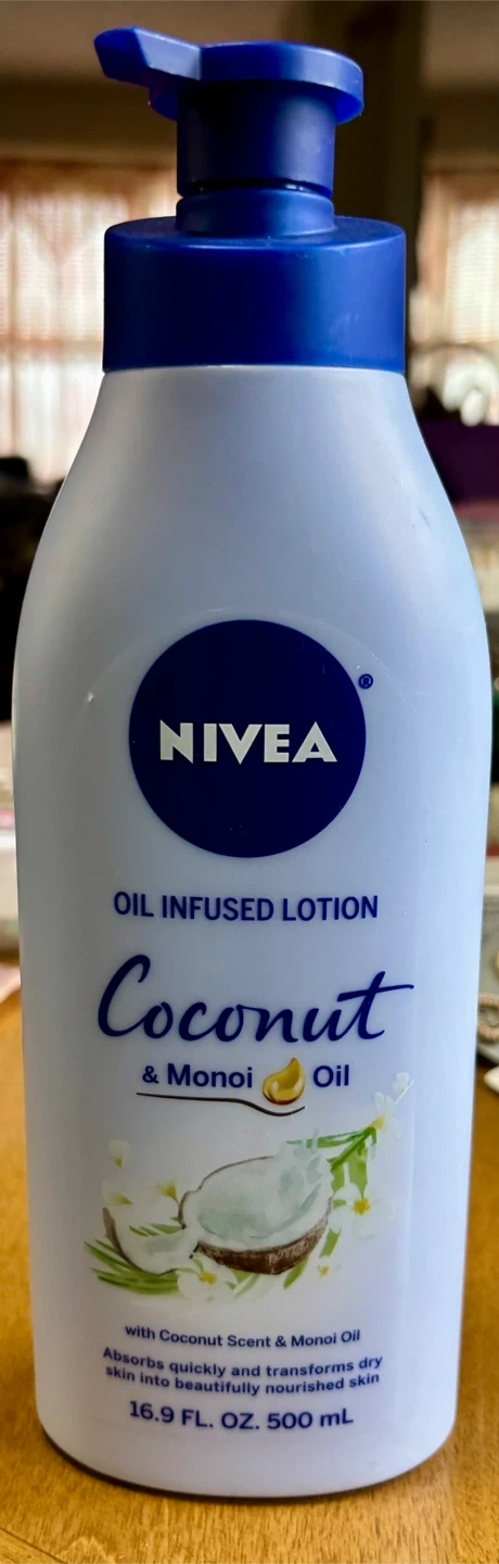 Nivea Oil Infused Lotion with Coconut Scent & Monoi Oil. Absorbs quickly and transforms dry skin into beautifully nourished skin. 16.9 FL. OZ. 500 mL. Dermatologically tested and approved.