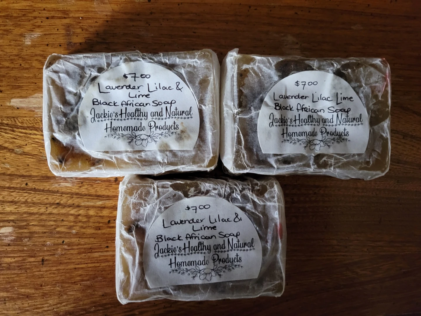 Three bars of homemade Lavender Lilac & Lime Black African Soap. These soaps are made by Jackie's Healthy and Natural Homemade Products. They're great for everyday use!