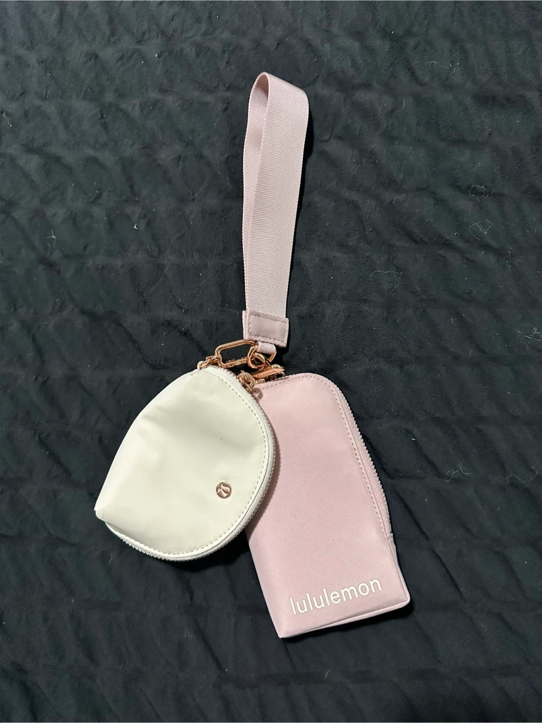 This Lululemon wristlet set comes with two pouches and a detachable strap. It's made of a smooth, durable material. These pouches are handy for organizing small essentials!