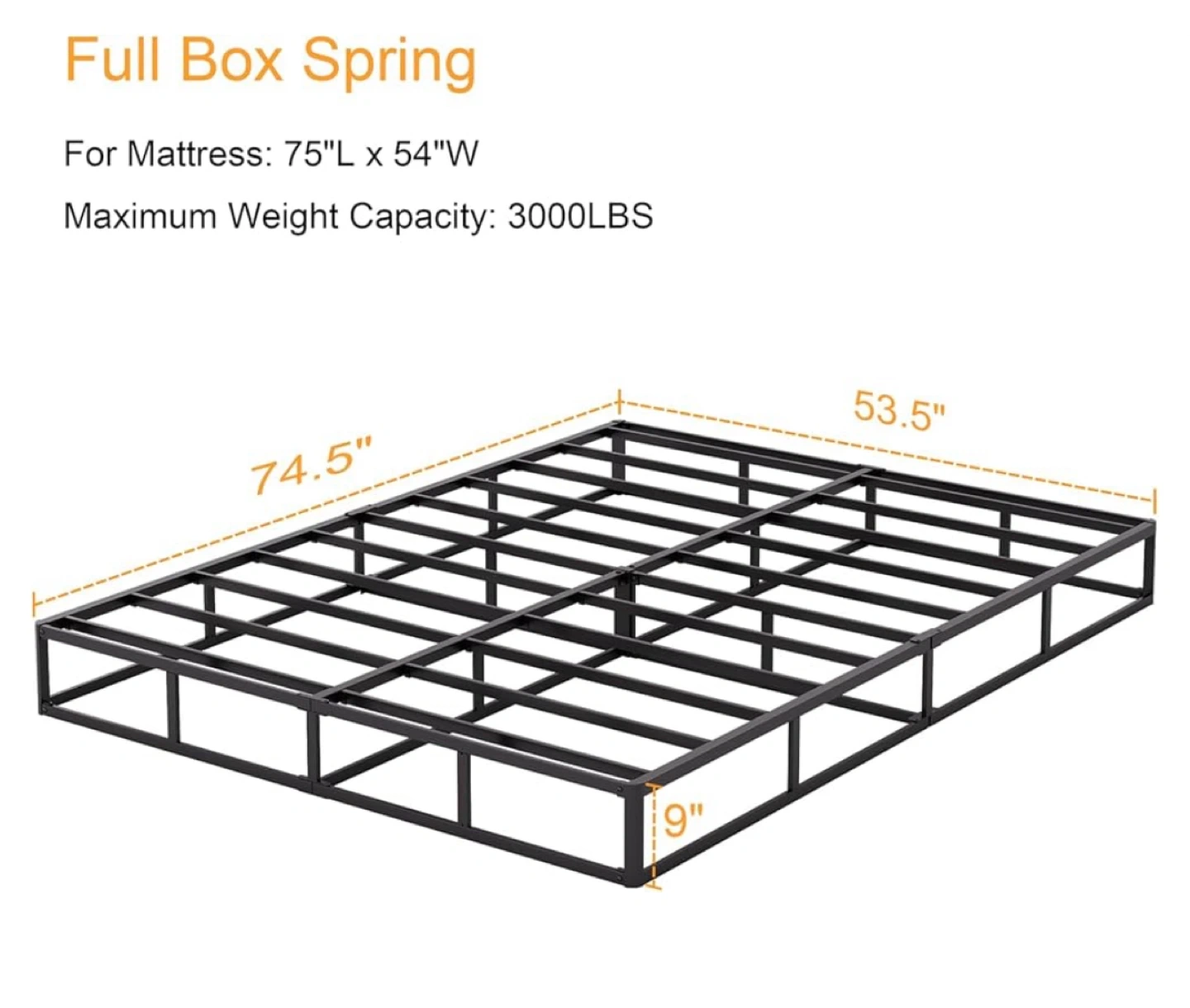 This is a full-size box spring bed frame. It's designed for a mattress measuring 75" L x 54" W. The frame supports a maximum weight capacity of 3000 lbs.