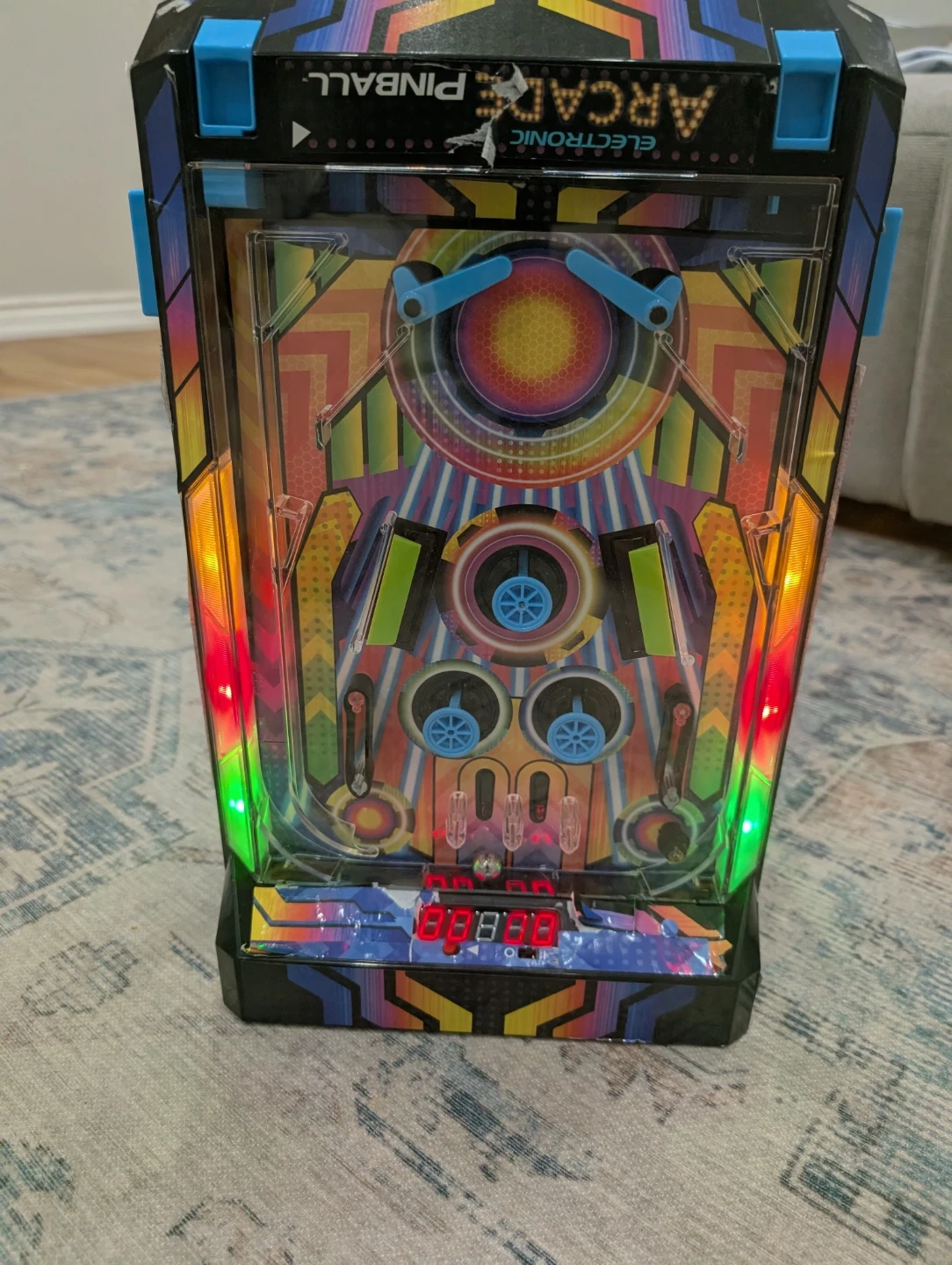This electronic arcade pinball machine features colourful retro graphics and flashing lights. It has a digital score display and multiple targets to hit. Fun for kids and adults alike!