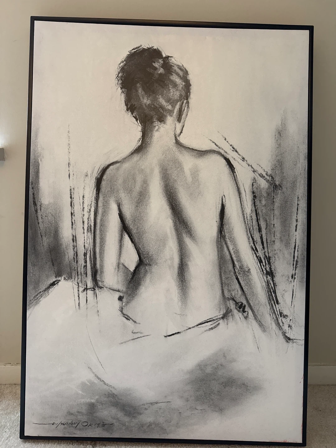 This is a large framed charcoal print of a figure. It's mounted in a black frame and made in Canada. It would add a touch of artistry to any room!