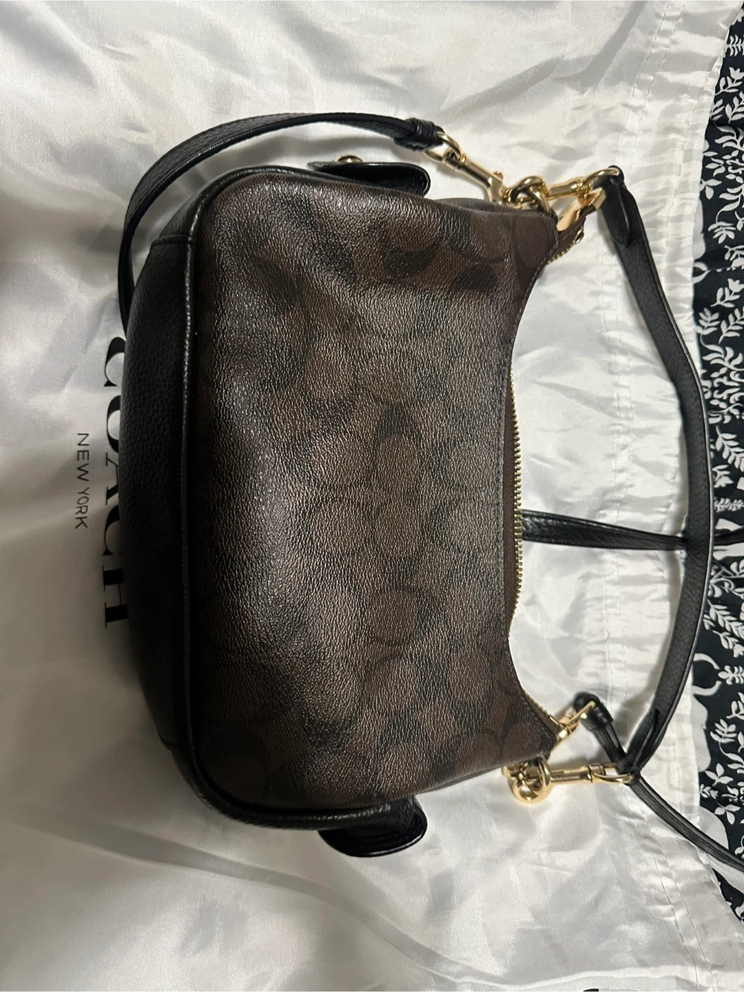 Brown and black Coach shoulder bag with signature "C" pattern. It features gold hardware and a zip closure. Includes a dust bag.