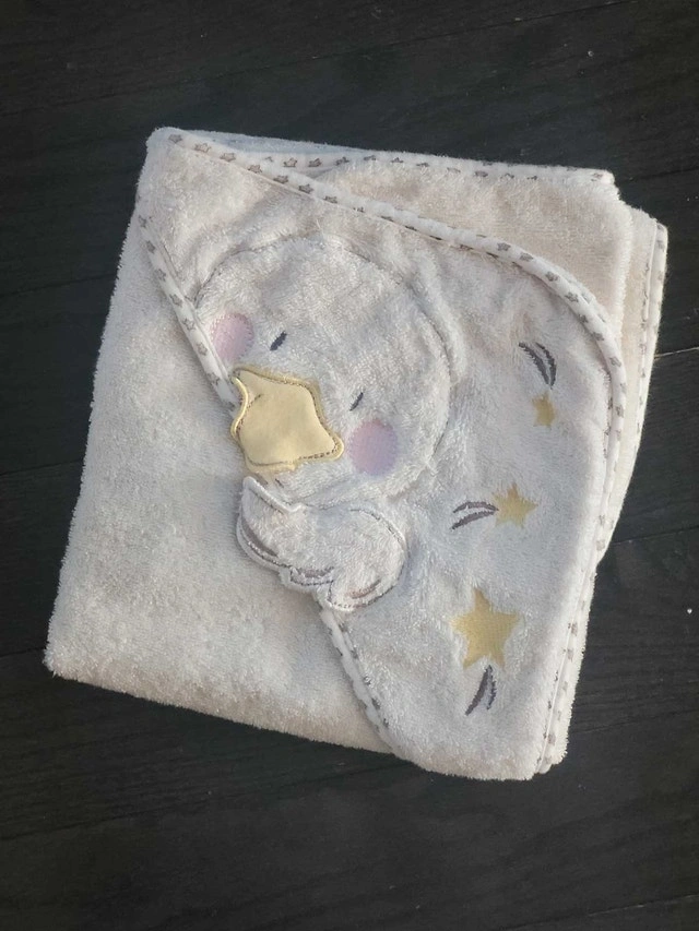 This is a cute Babies R Us hooded baby towel with an applique duck and stars. This blanket is clean and in excellent condition, ready to keep your little one snug after bath time. It's like a warm hug from a cloud—if the cloud was made of super-soft material and had adorable ducklings on it! Cash accepted.