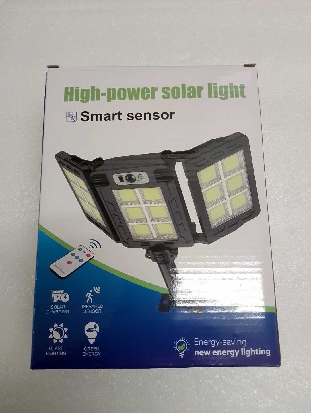 This high-power solar light features a smart sensor and three modes. It offers solar charging, glare lighting, and green energy. The light has modes for human body sensing and dim light. Made in China.