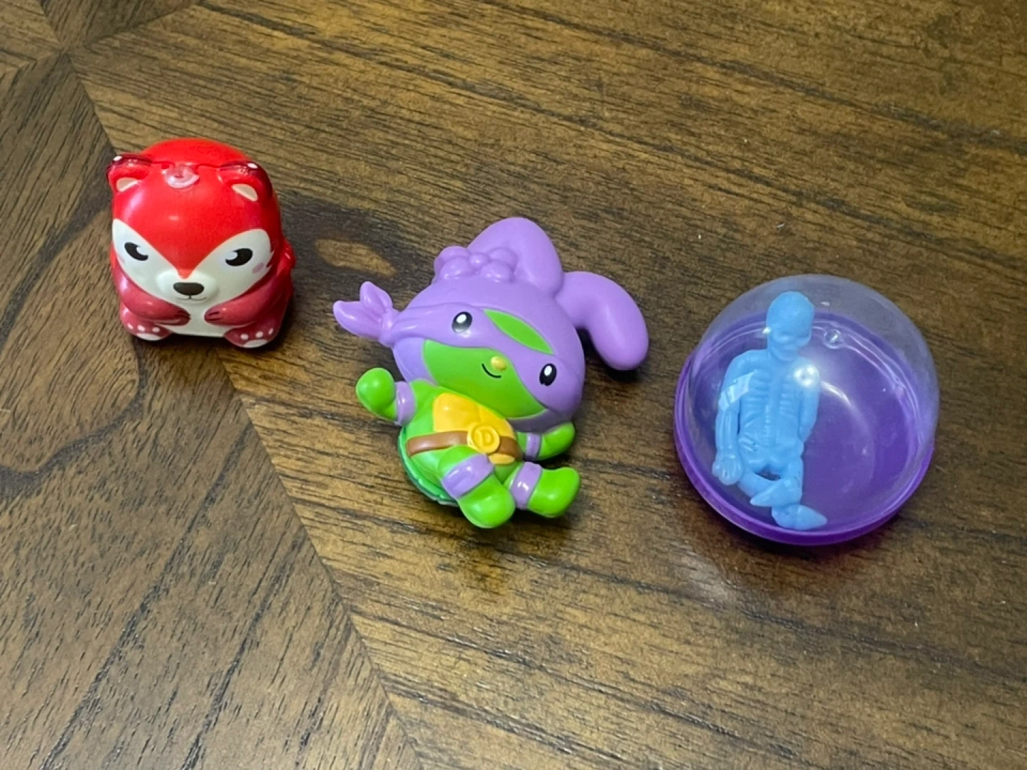 This is a set of three small collectible figurines. One is a red fox-like creature, another is a purple and green character resembling a Teenage Mutant Ninja Turtle, and the third is a blue skeleton figure inside a clear capsule.