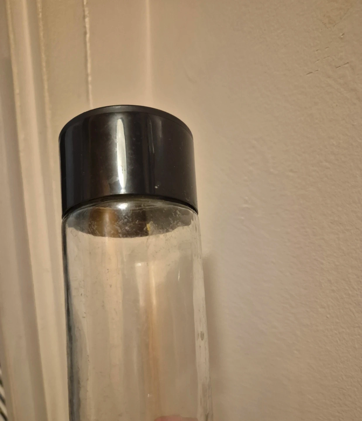 This is a clear glass spice jar with a black plastic lid. It's ready to be refilled with your favorite spices. The glass body is durable and easy to clean.