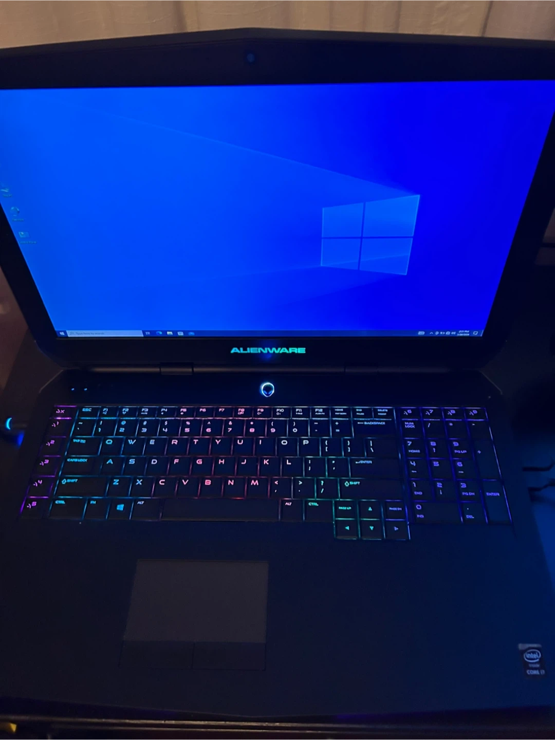 This is an Alienware laptop with a colourful backlit keyboard. It's a powerful machine ready for gaming or demanding tasks. It comes with an Alienware branded backpack, perfect for transporting your laptop safely.