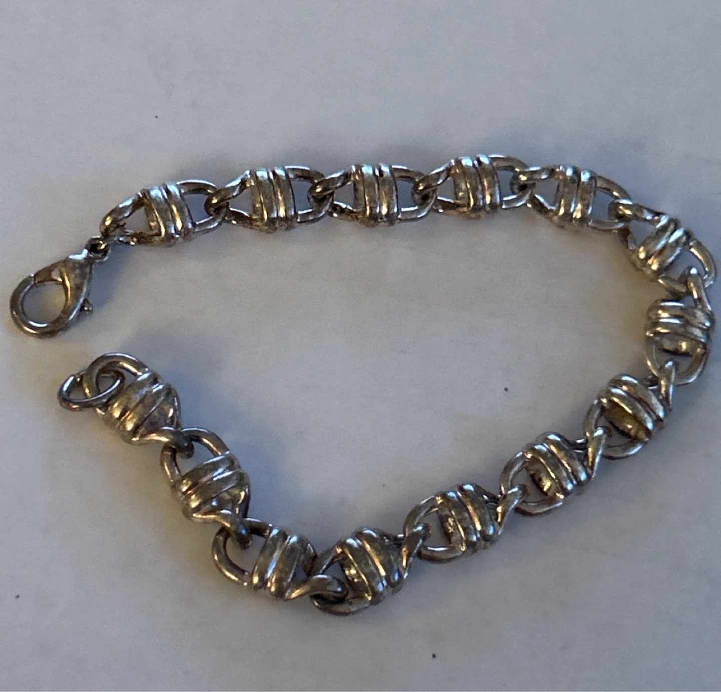 Selling a silver chain bracelet with a unique interlocking link design. It features a secure lobster clasp closure. This bracelet adds a touch of classic style to any outfit!
