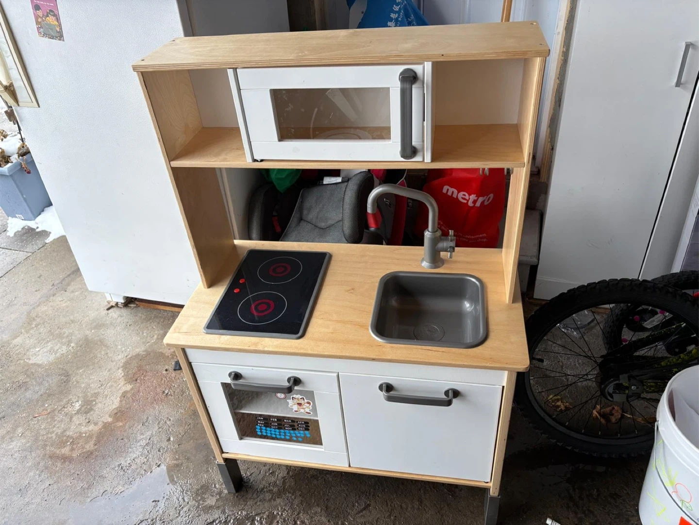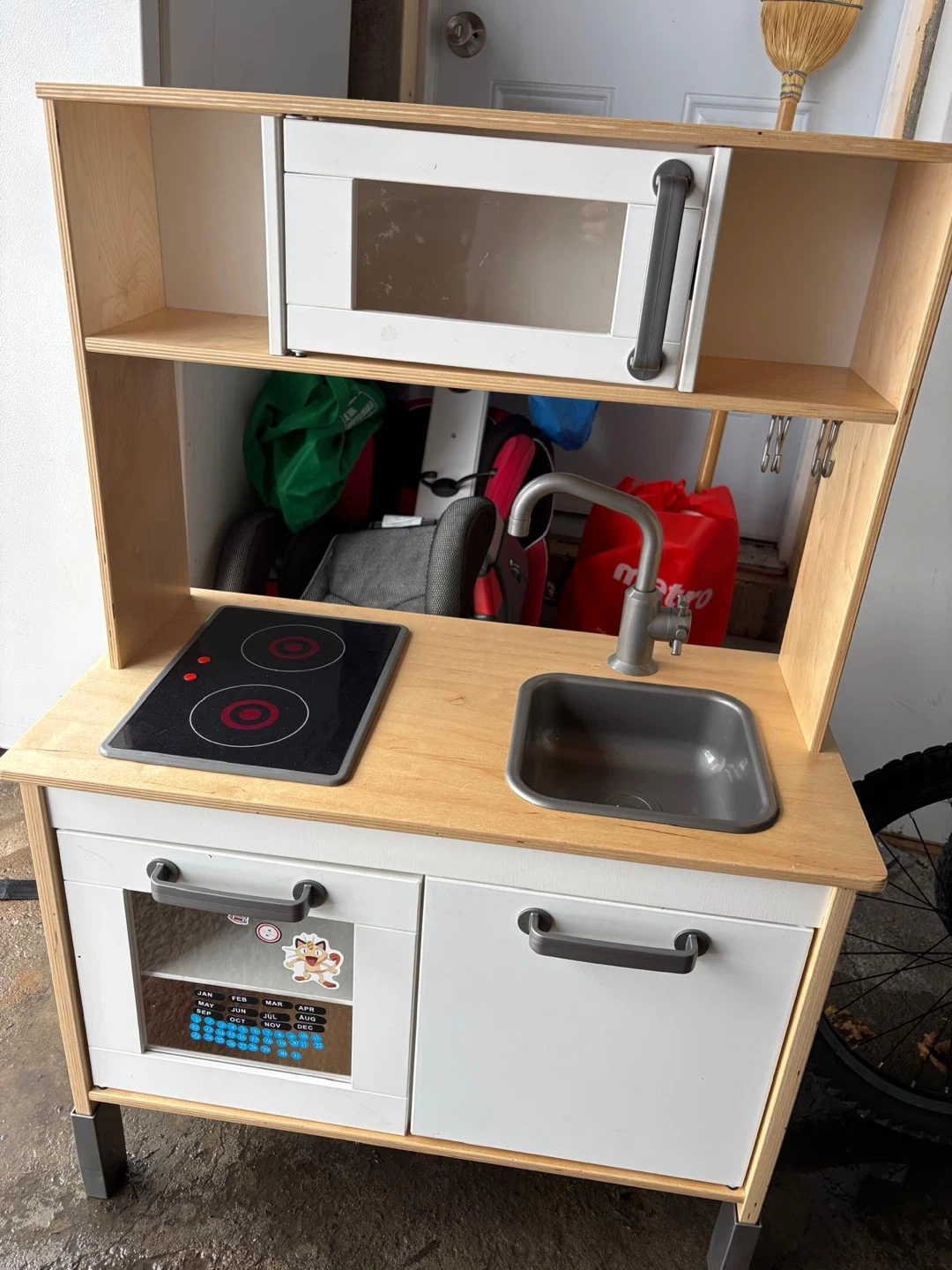 IKEA kid's play kitchen features a stovetop, sink, and microwave. It includes various play pots, pans, and a wooden crate of colourful dishes, food, and other accessories.