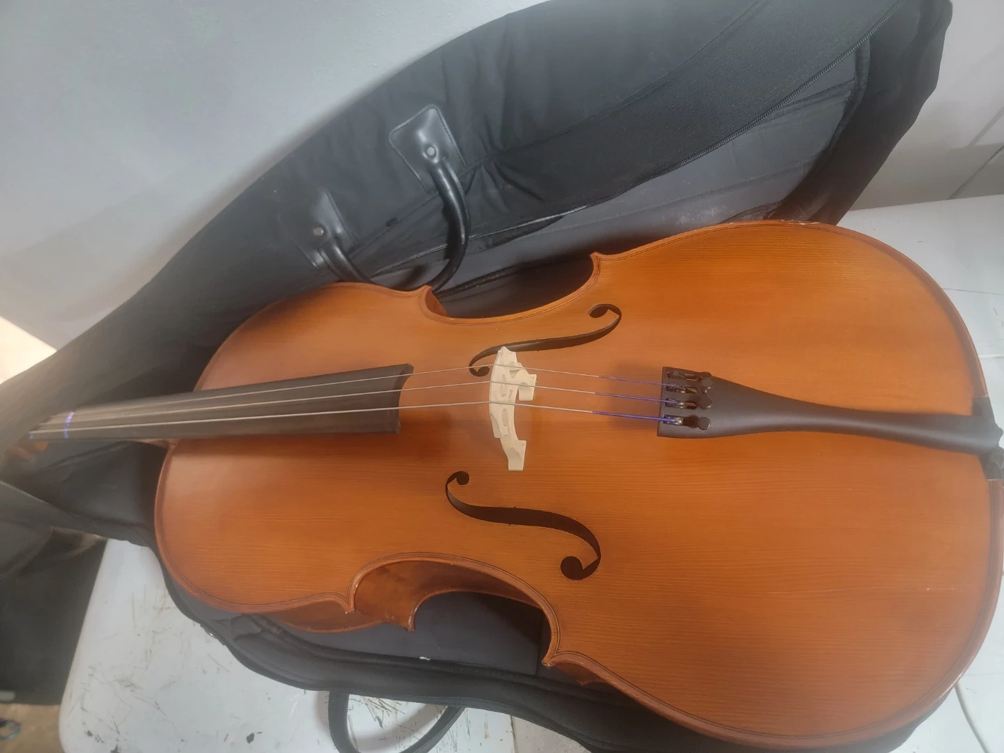 This is a 4/4 size Carlton CVC100 Cello Outfit with a padded bag. It features a wooden body and tuning pegs. There's a noticeable scratch on the surface of the cello's body. It's a nice instrument for learning or playing.