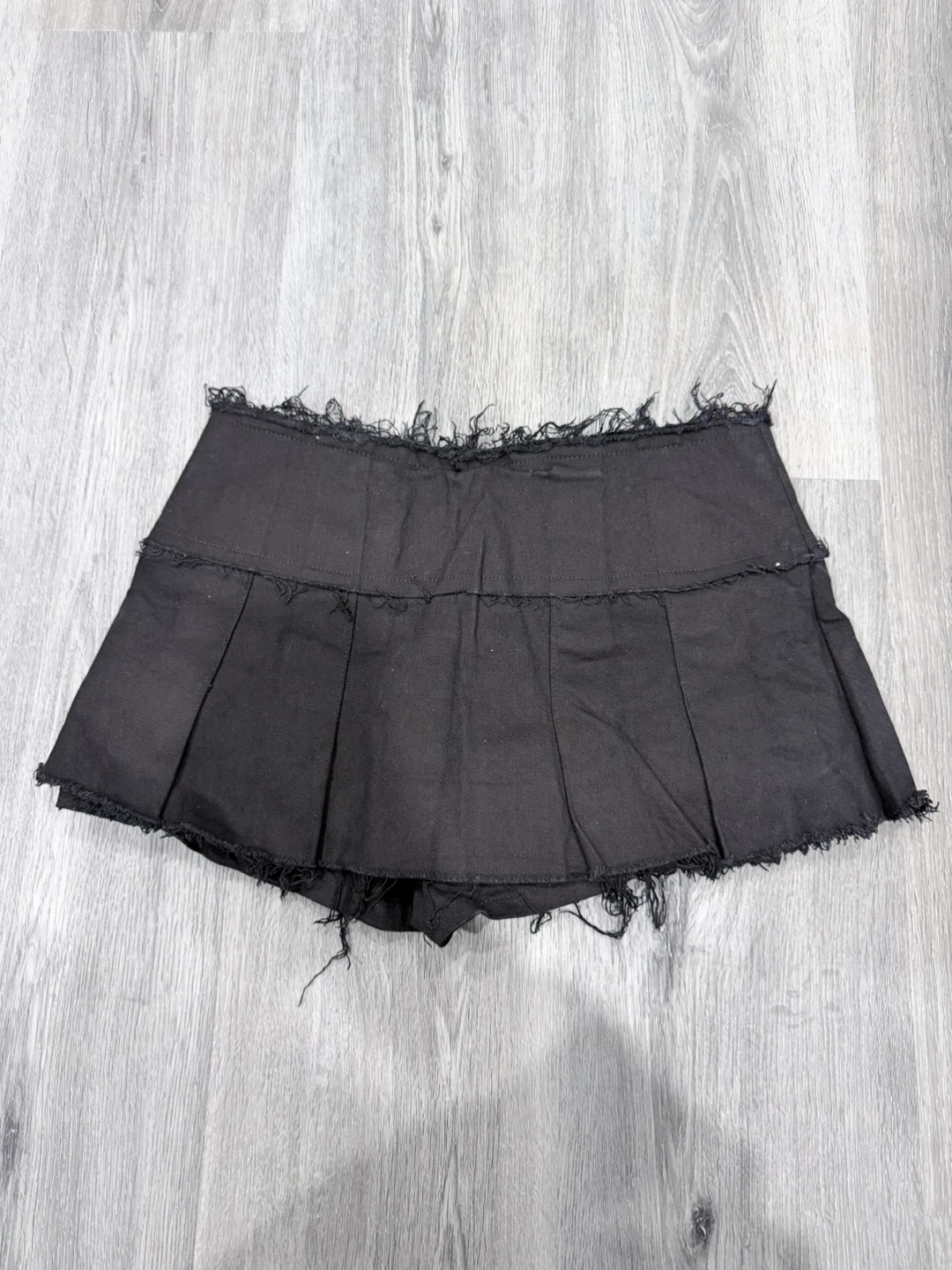 Bought in Seoul. This black mini skirt features a pleated design and distressed, frayed hem. It has a button-up front. Constructed from denim material. Never worn.