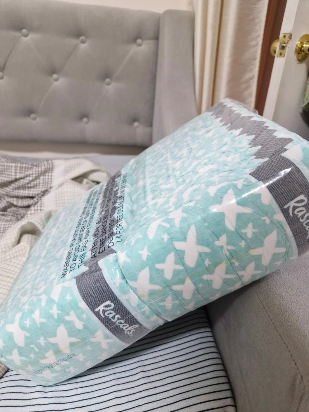 New package of Rascals diapers. These feature a cute bird print design. Comes in a sealed plastic bag. 4 bags, 200 diapers.