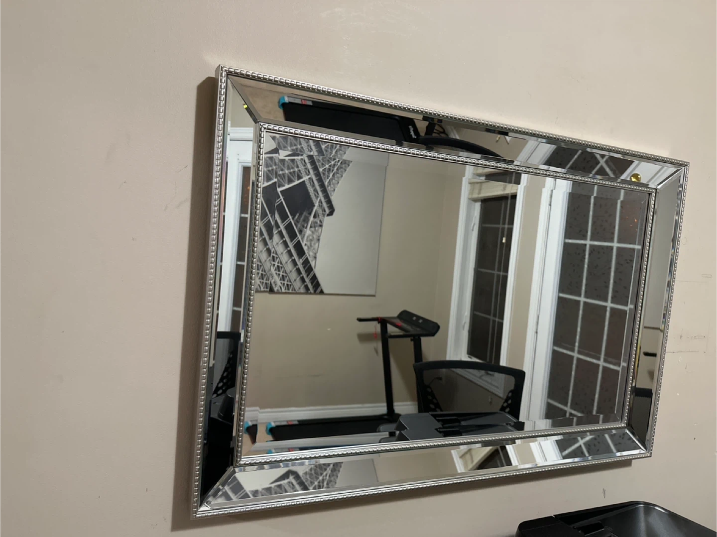 This is a decorative mirror with a silver-toned frame. The frame features a beaded detail along the inner and outer edges. It's ready to hang and would add a touch of elegance to any room.