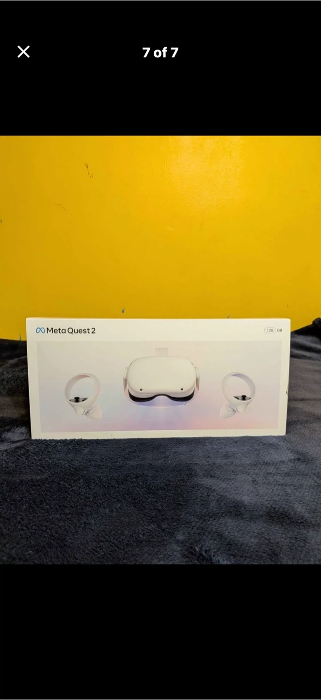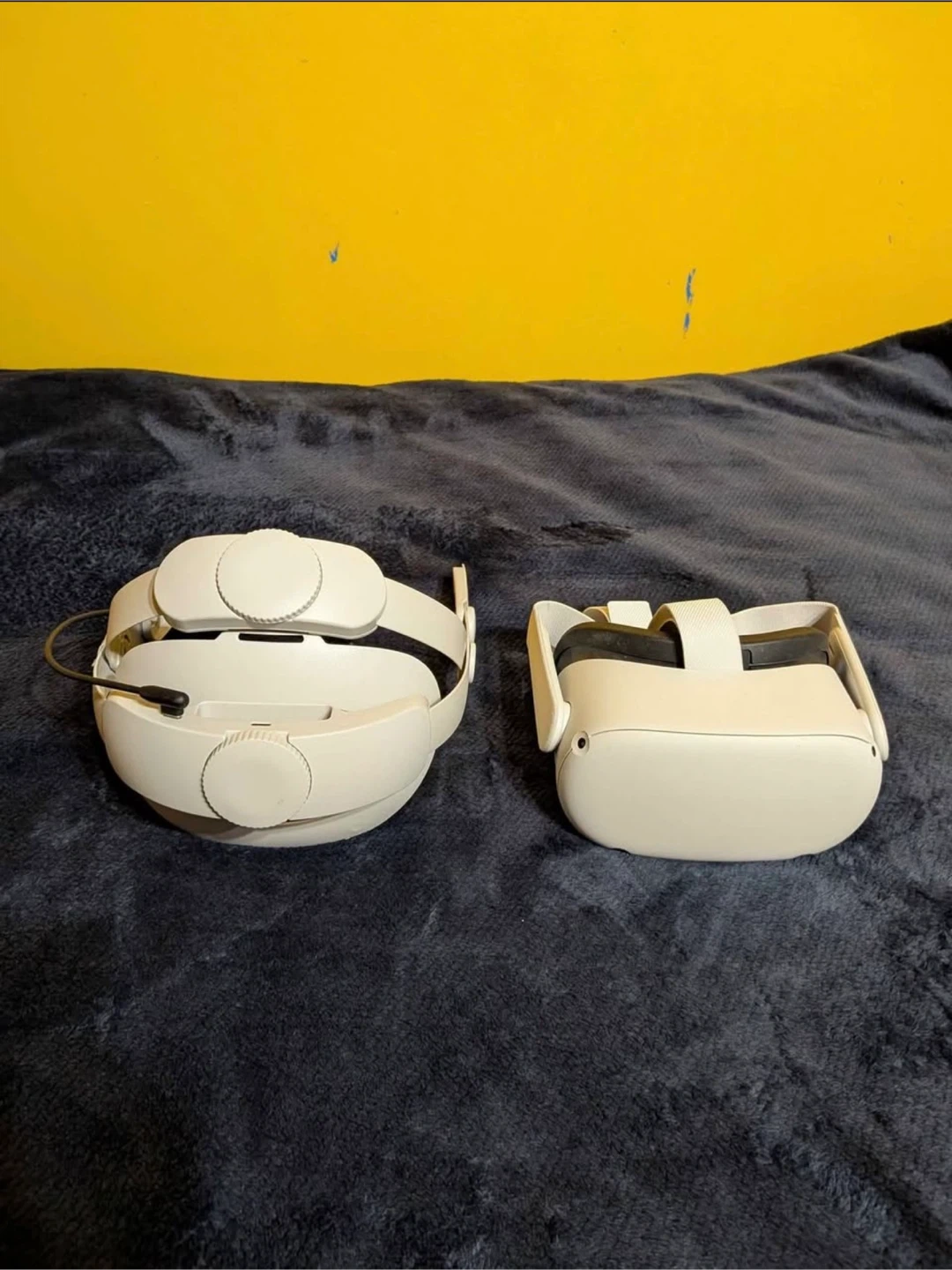 This is a complete Meta Quest 2 VR headset package. It includes the headset, controllers, head strap, and charging accessories. The original box is also included.