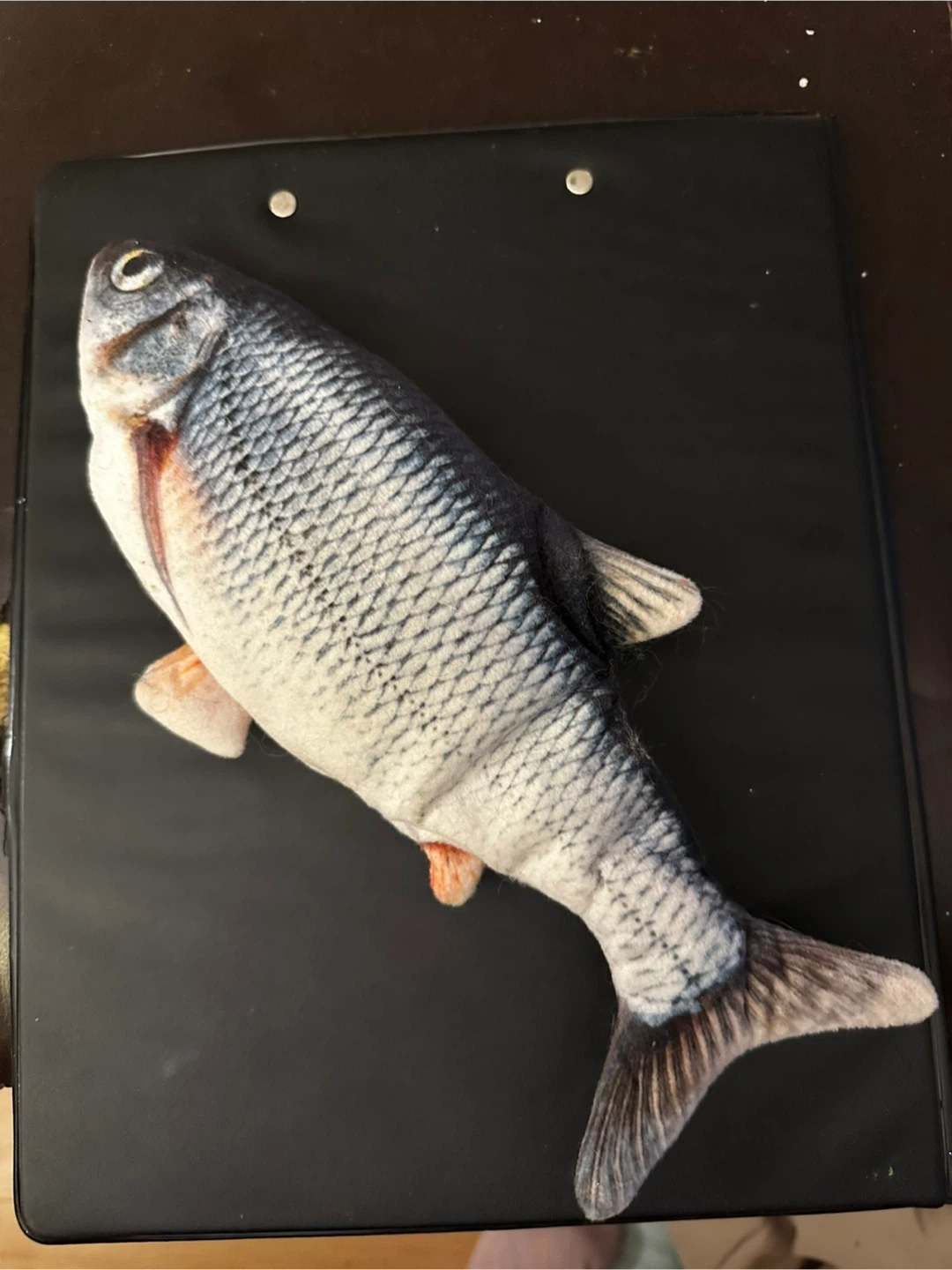 This is a plush toy shaped like a fish. It's designed to look realistic with scaled details. The soft material makes it great for pets to play with.
