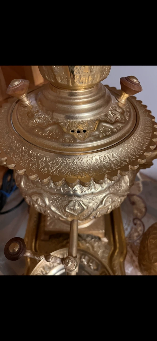 This is a beautiful ornate brass samovar set, complete with a matching pitcher and bowl. It features intricate embossed designs all over. A lovely decorative piece for any home!