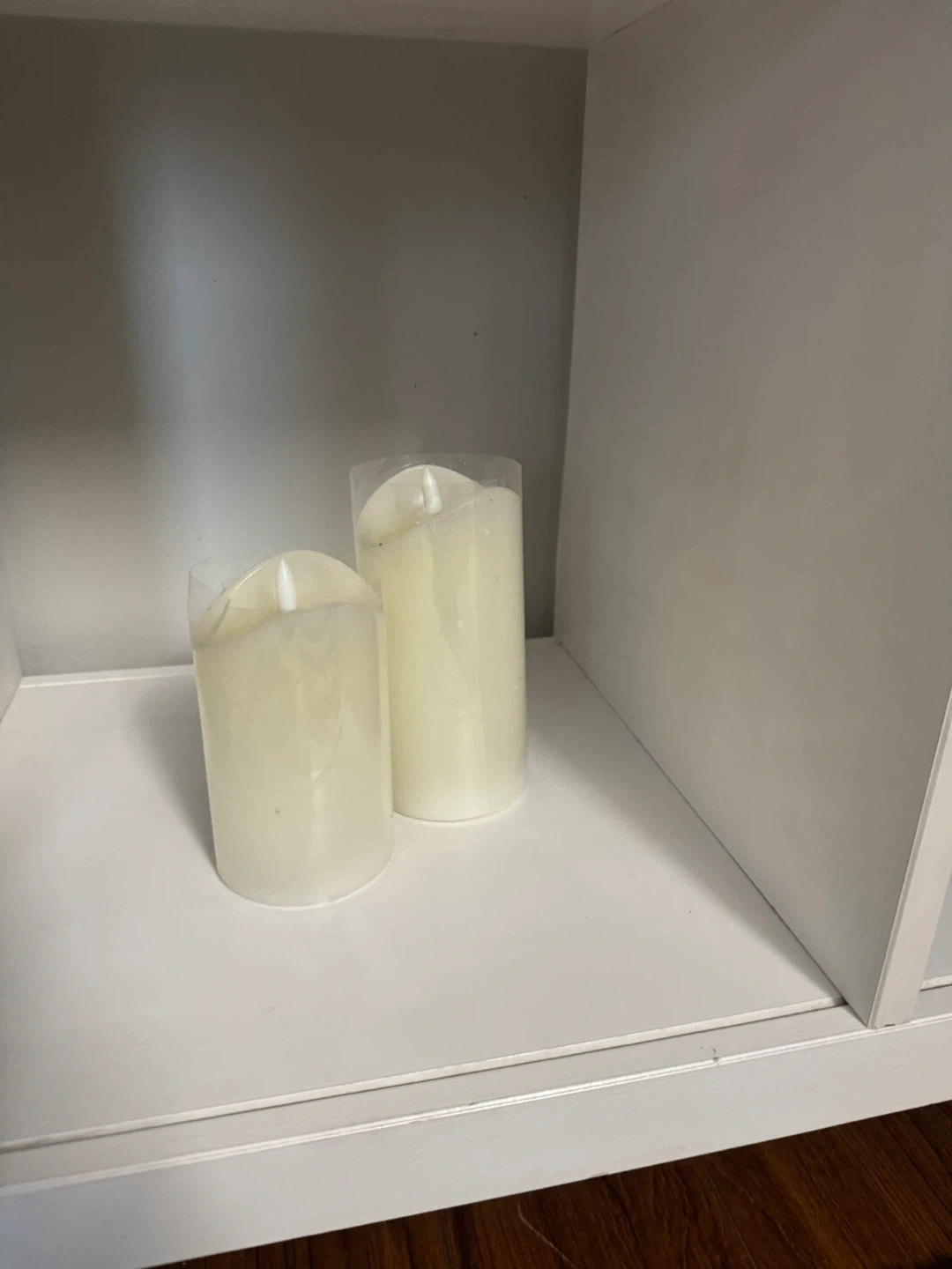 Two cream-coloured LED pillar candles with realistic flame effects. These candles offer a safe alternative to real flames for creating ambiance. They run on batteries, not included.