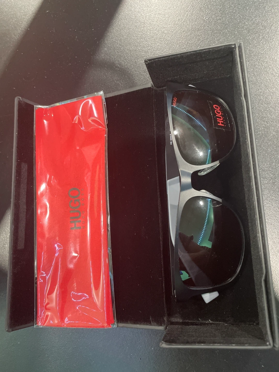 These Hugo Boss sunglasses feature a sleek, modern design. They come complete with their original protective case and a cleaning cloth. Perfect for sunny days!