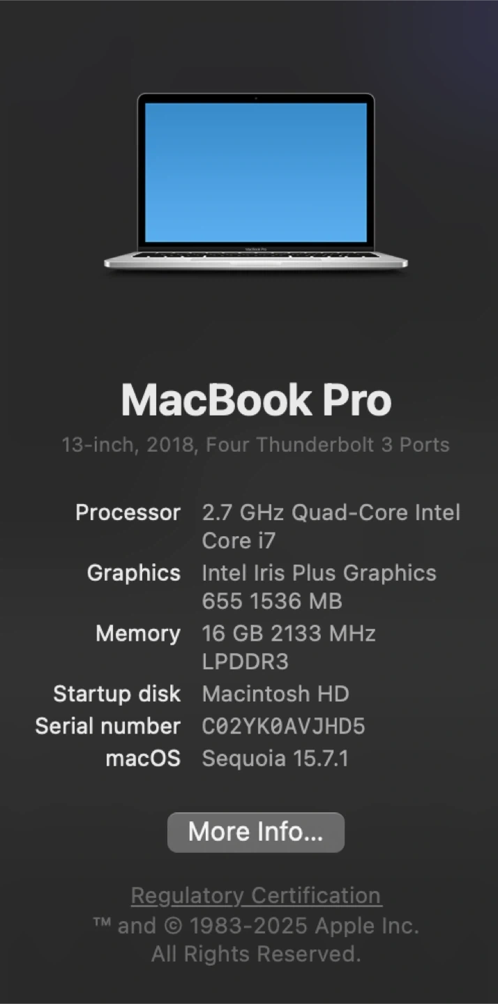 This MacBook Pro features a 13-inch display and 2018 model year. It's powered by a 2.7 GHz Quad-Core Intel Core i7 processor with 16 GB of RAM. The storage is a 256 GB SSD. It runs on macOS Sequoia 15.7.1.