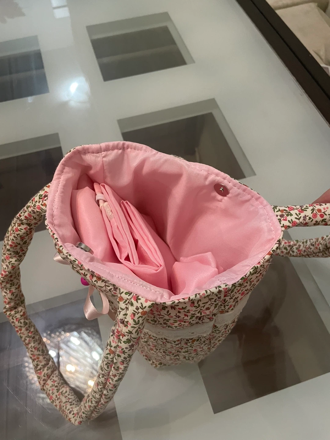 This sweet quilted handbag features a charming floral print and lace trim. It's lined in pink satin and has a secure snap closure with pink pray cloth set for kids (4-5 years old)the bag perfect for carrying the set