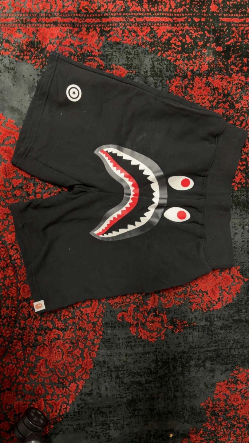Black BAPE shorts featuring the iconic shark face graphic and "WGM" lettering. Made with comfortable fabric. These shorts are sure to make a statement!