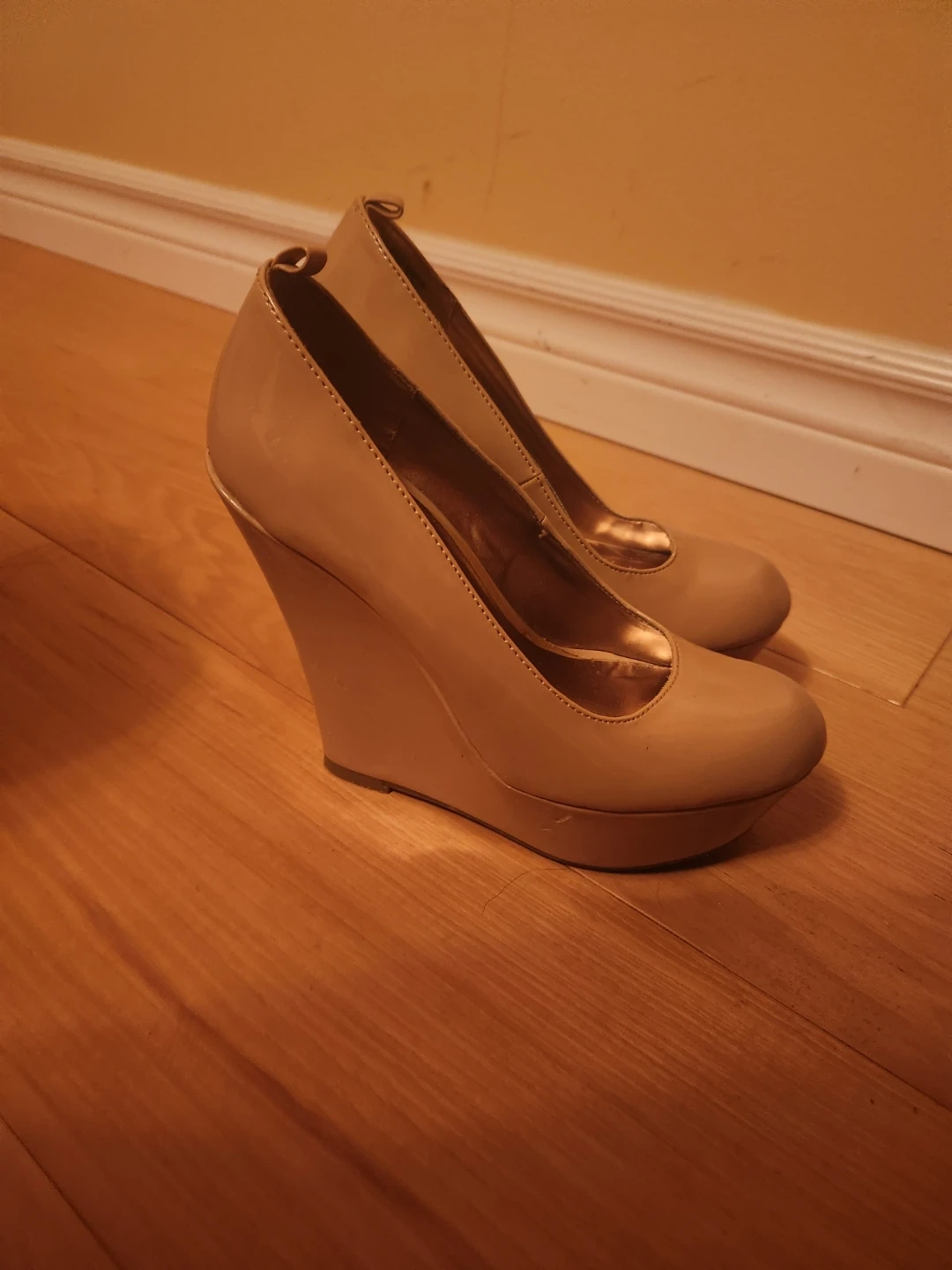 Classic nude wedge heels perfect for dressing up any outfit. These shoes have a shiny patent finish and a comfortable platform sole. They're a stylish addition to your shoe collection!
